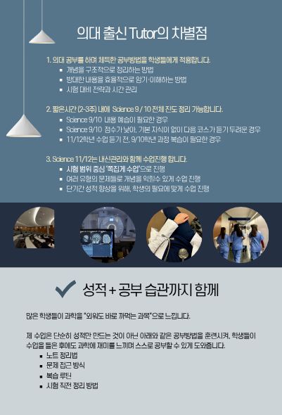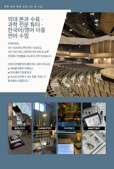 안녕하세요. Science 9–12 (Chemistry / Biology / Physics)을 전문적으로 수업하고 있는 과학전문 강사입니다.
