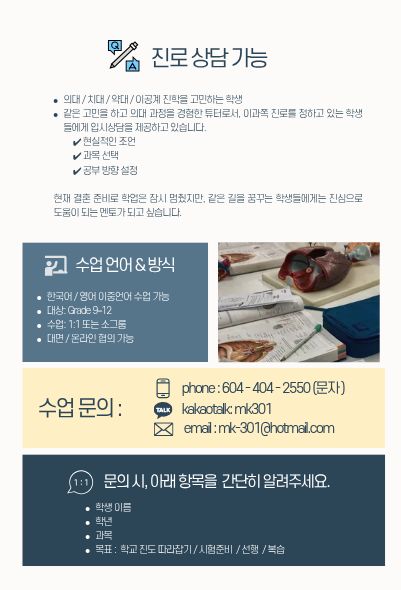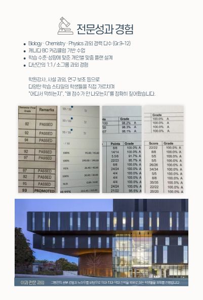저는 중고등학교를 밴쿠버에서 마치고, 맥길대 입대 후, Xavier University에서 의대 본과 2학년까지 수료하였으며,지난 10년 이상 캐나다 BC 커리큘럼을 기반으로 고등학생 Biology, Chemistry, Physics를 지도해 왔습니다.