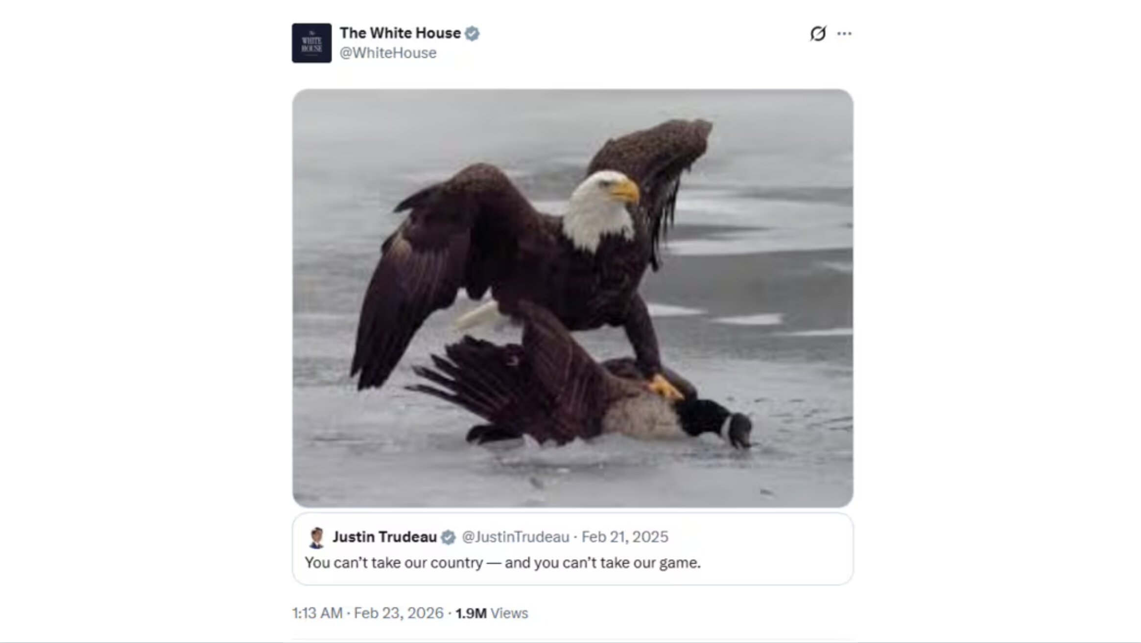 트럼프는 이날 경기가 끝난 직후 자신의 소셜미디어인 ‘트루스 소셜’에 곧바로 축하 메시지를 게시했다. 마이크 설리번 감독은 트럼프가 선수들을 축하하기 위해 영상 통화인 ‘페이스타임’도 했다고 언론에 밝혔다. 백악관의 공식 소셜미디어 계정에는 금메달을 자축하는 게시물이 여럿 올라왔는데 압권은 미국을 상징하는 공식 국조(國鳥)인 흰머리수리가 빙판 위에서 이른바 ‘캐나다 구스(Canada goose)’라 불리는 큰캐나다기러기를 제압하고 있는 장면이었다. 이 사진을 올리면서 “우리나라를 빼앗을 수 없고, 우리와의 경기에서도 승리할 수 없다”는 쥐스탱 트뤼도 전 캐나다 총리의 1년 전 발언도 공유해 재소환했다.