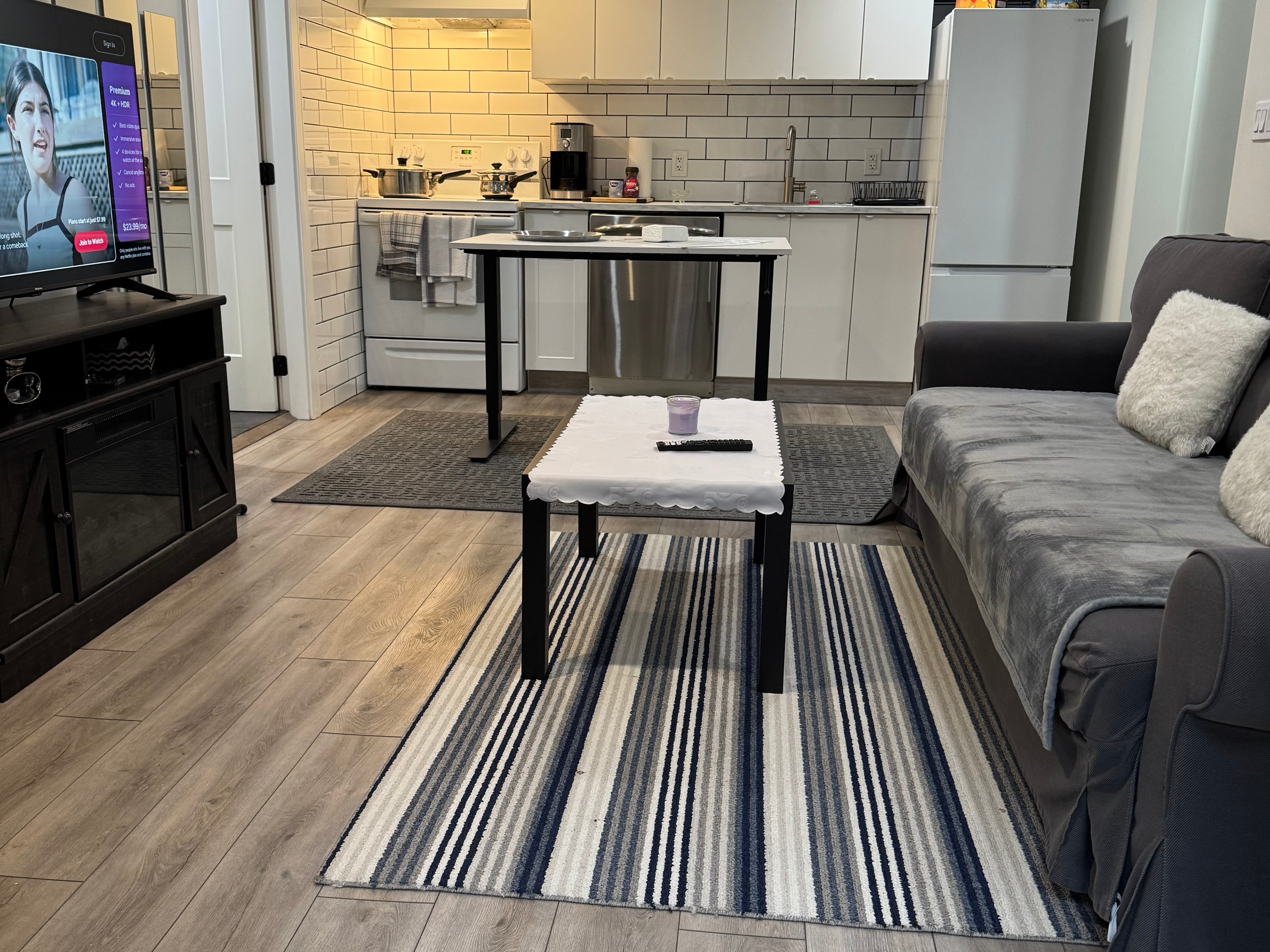 •Spacious living room with flat screen TV, couch with pullout
