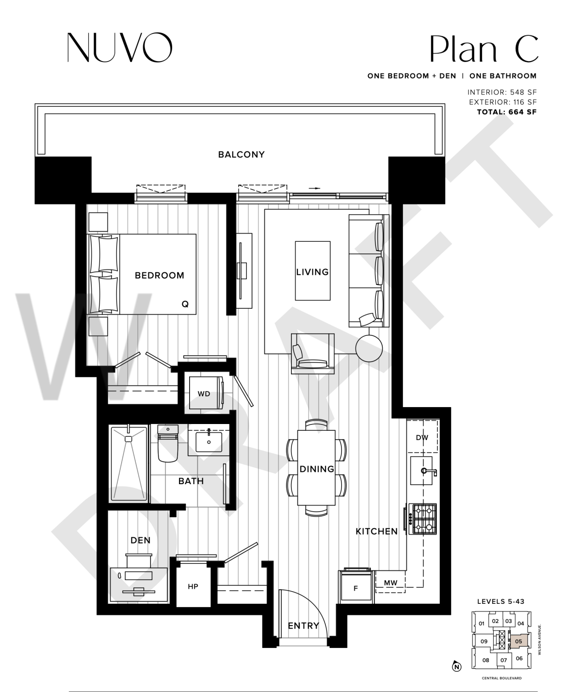 34층 1 Bed + Den 1 Bath 548 Sq.ft + 발코니 116 Sq.ft 동향 유닛 [스토리지 & 주차장 1개 포함]