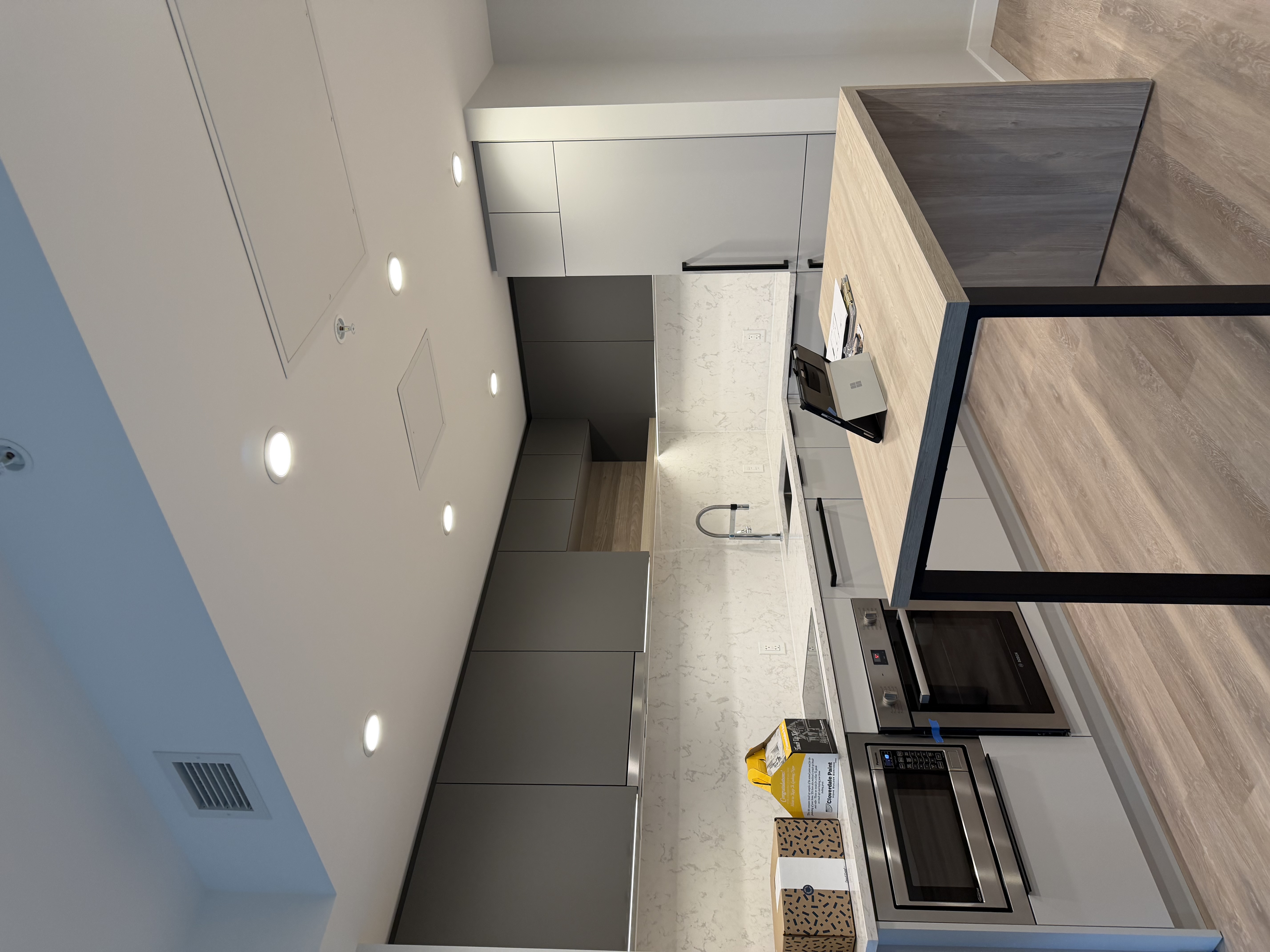 Bosch 빌트인 주방 가전, L 자형 주방과 테이블이 배치되어 있으며,