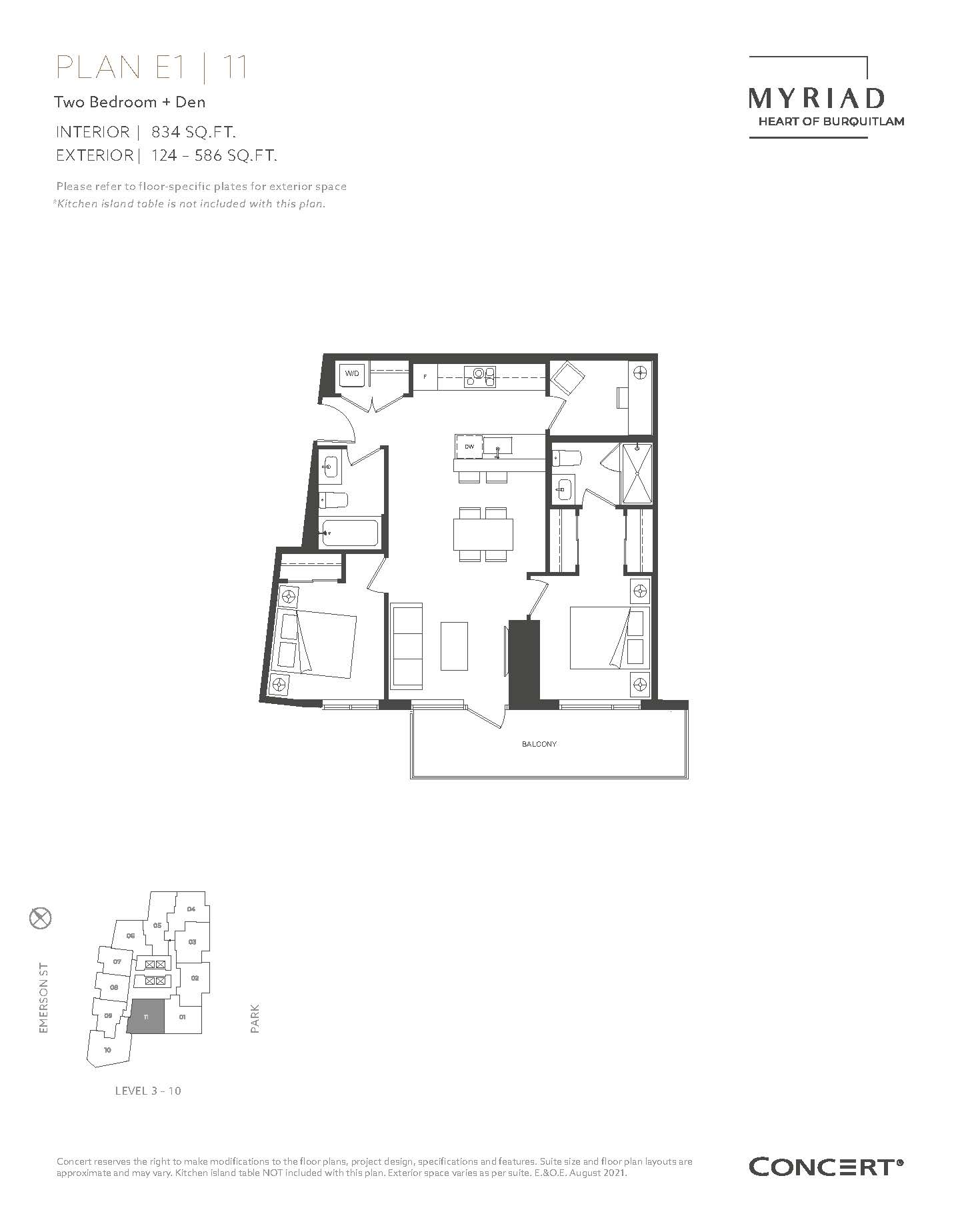 2 Bedroom + 1 Den + 2 Bathroom (Interior 834 sq.ft.) / Balcony