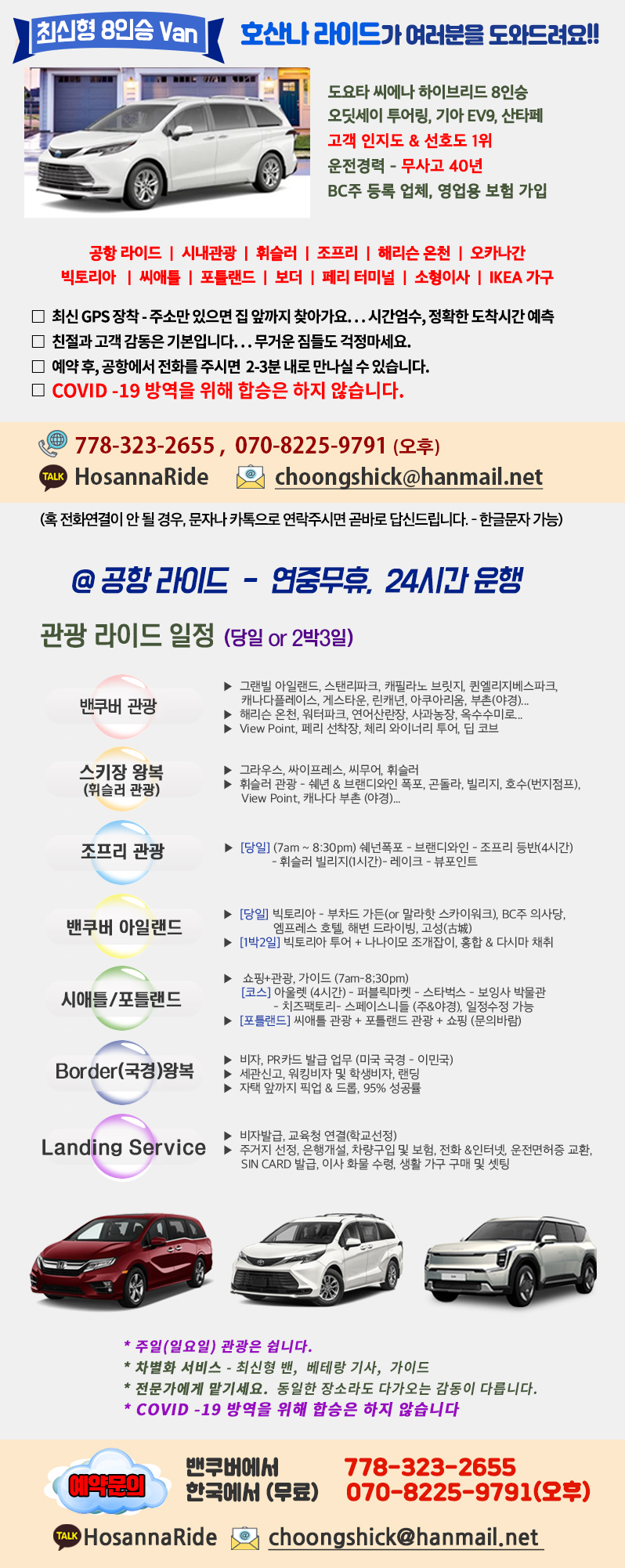 《호산나 공항라이드 요금 할인가》 (차량은 모두 7-8인승 2024-2026년 최신형 밴, 대형 SUV로만 움직입니다. (소형차는 사용을 안 합니다) EX) 도요타 씨에나 하이브리드, 혼다 오딧세이 투어링, 기아 EV9, 텔룰라이드, 산타페...