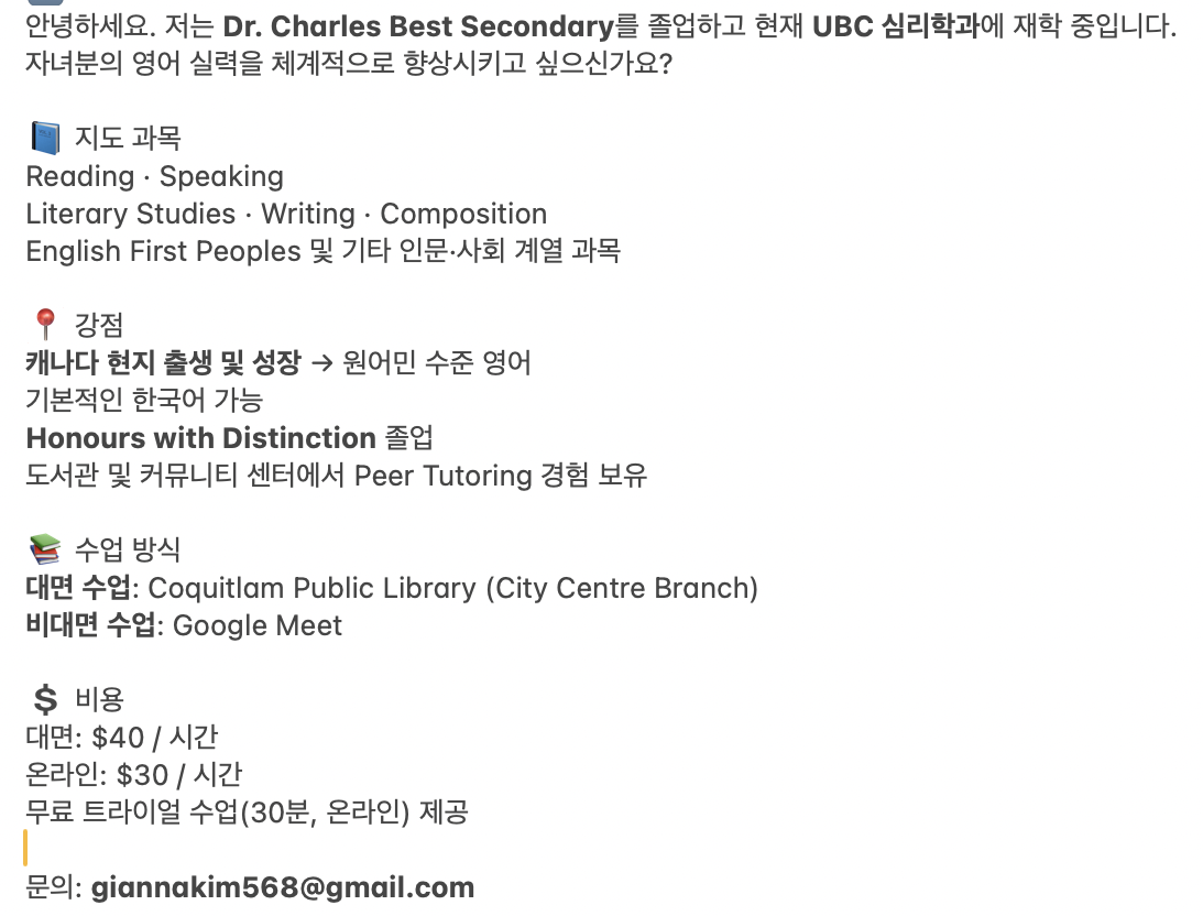 Dr. Charles Best Secondary 졸업하고 현재 UBC 심리학과 재학중 입니다.자녀분들께서 영어 튜터 필요하신가요?