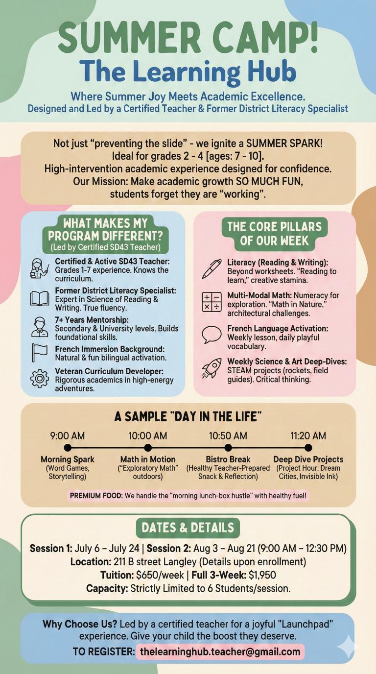 대부분의 캠프는 학생이나 비전문가가 지도하지만, 더 러닝 허브는 공인된 현직 교사인 제가 직접 지도합니다. 저는 수년간의 경험을 활용하여 즐거우면서도 철저한 학습이 이루어지는 "발사대(Launchpad)"를 만듭니다. 아이들은 학교에 있다고 느끼지 않고, 즐거운 여름 임무를 수행 중이라고 느낄 것입니다.