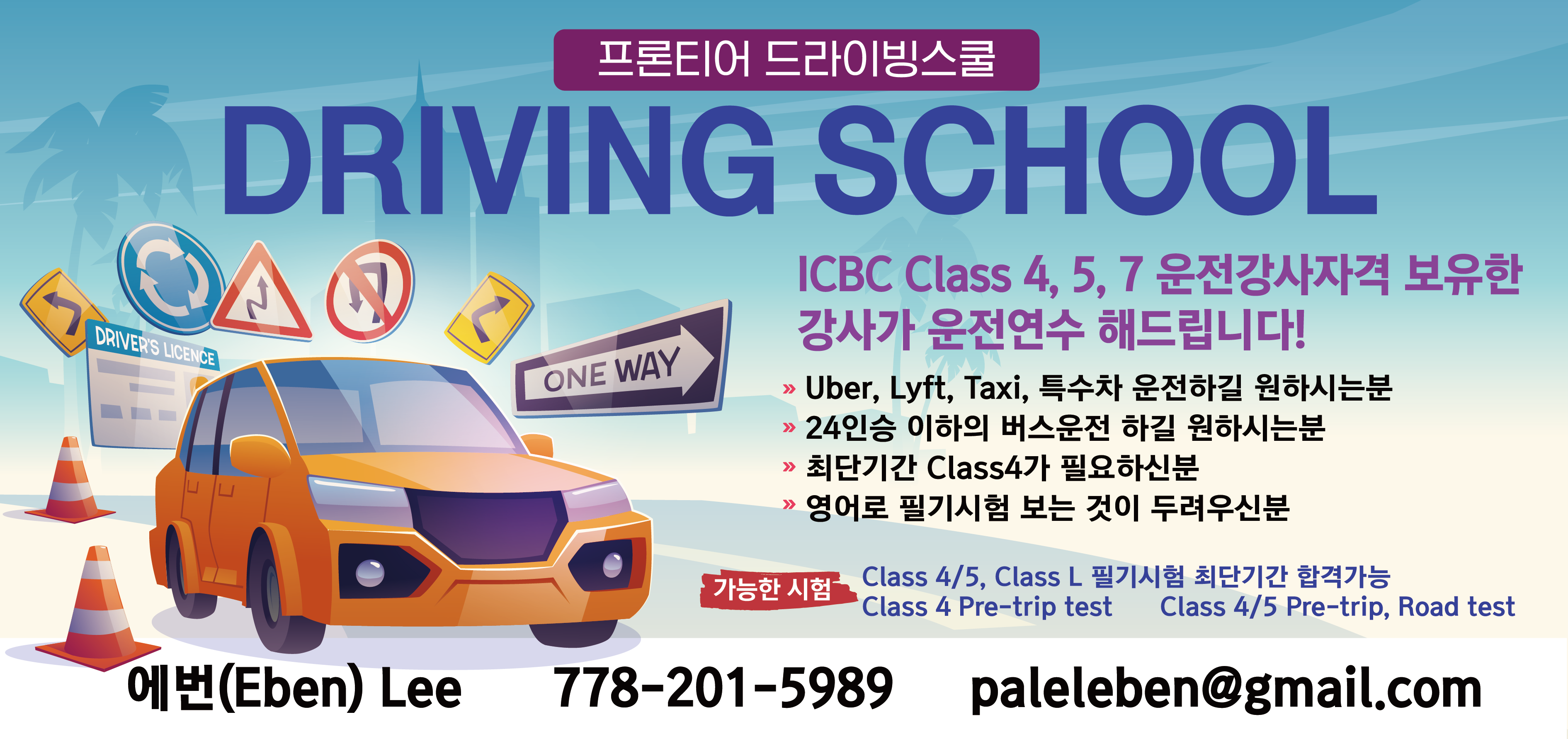 # Class4/5/7 운전면허 한국어와 영어로 강습해 드립니다.