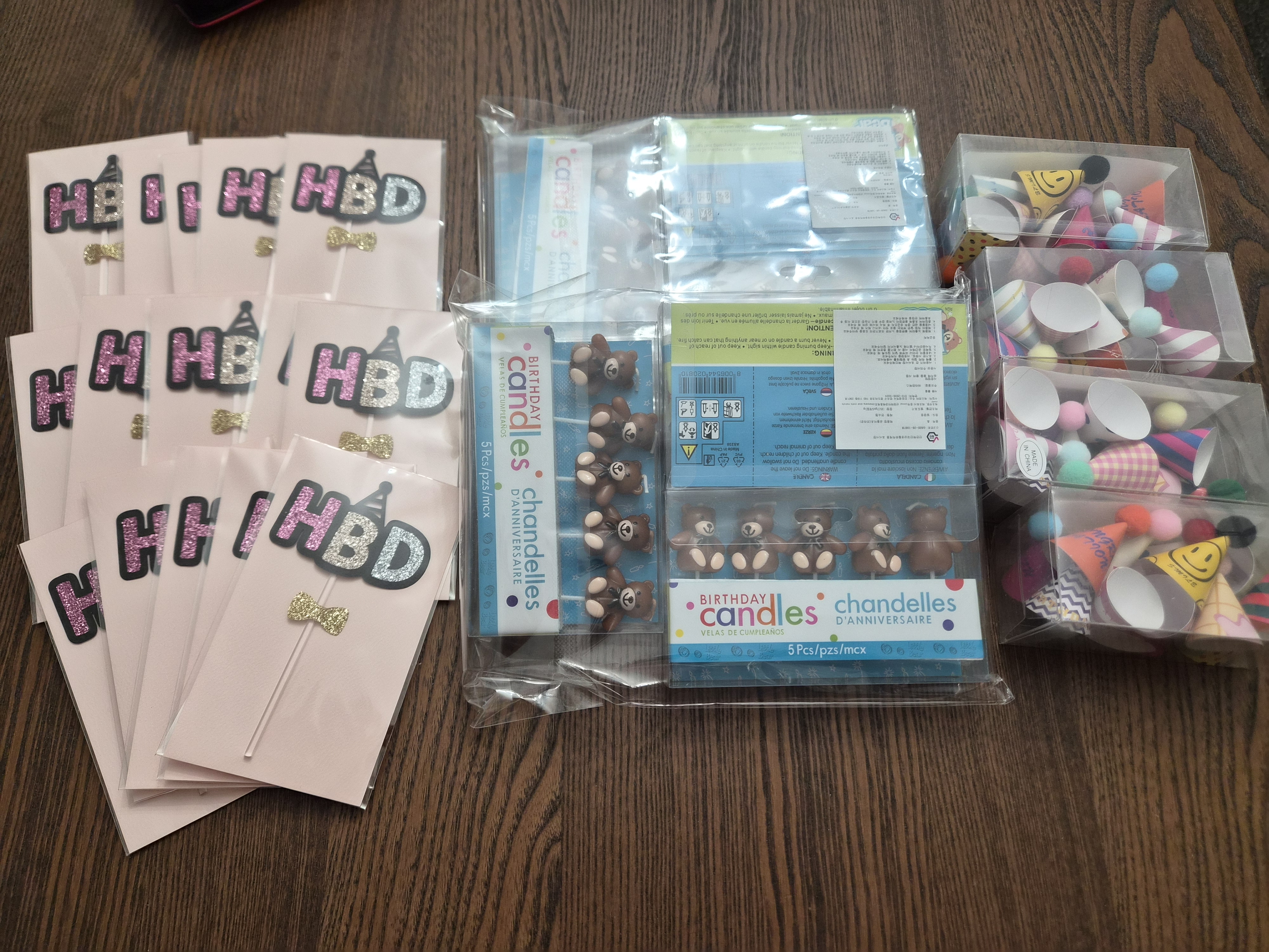 사진에 보이는 HBD 토퍼, 꼬깔모자, 곰돌이 캔들 일괄로 $50에 판매합니다.