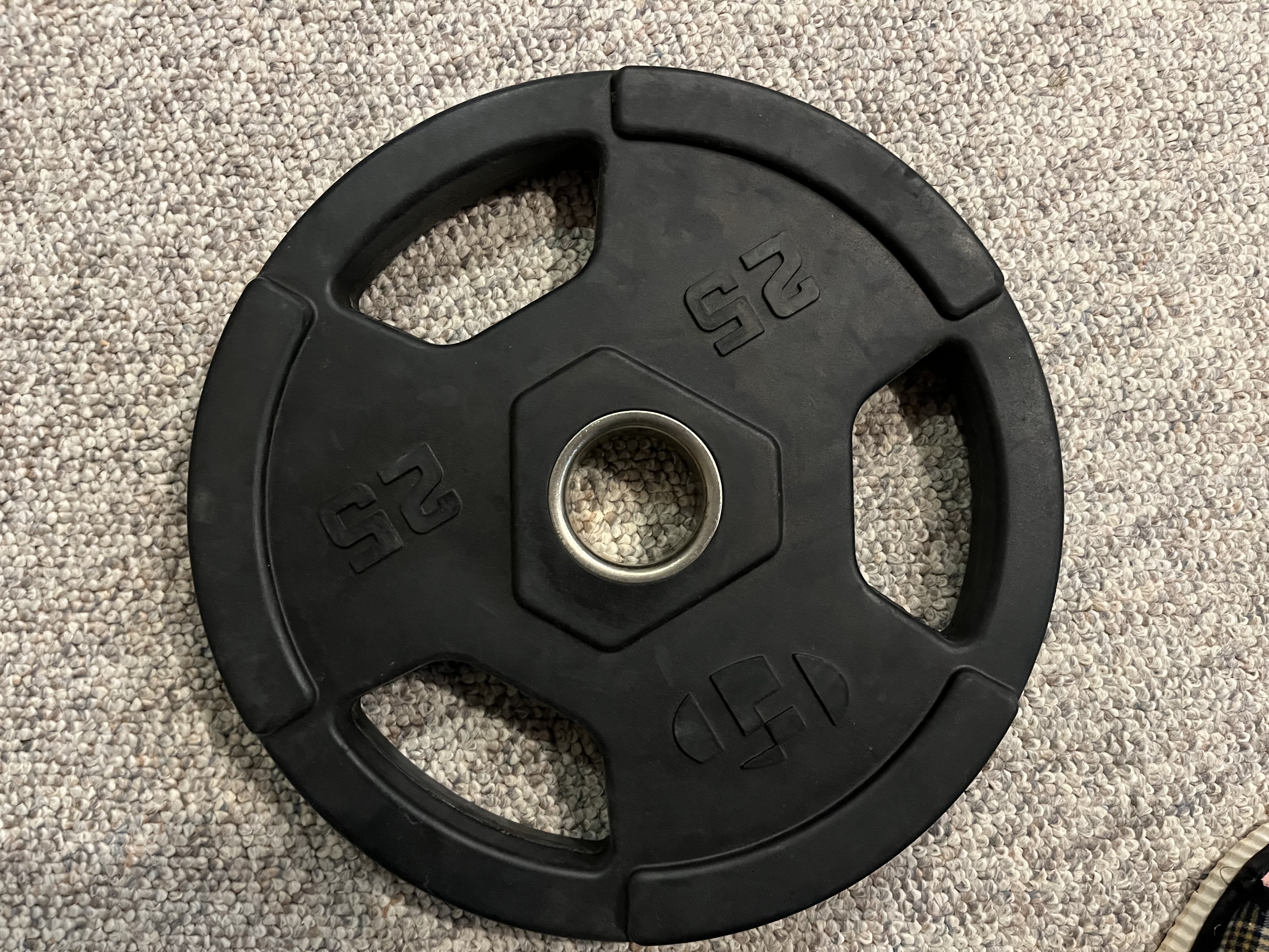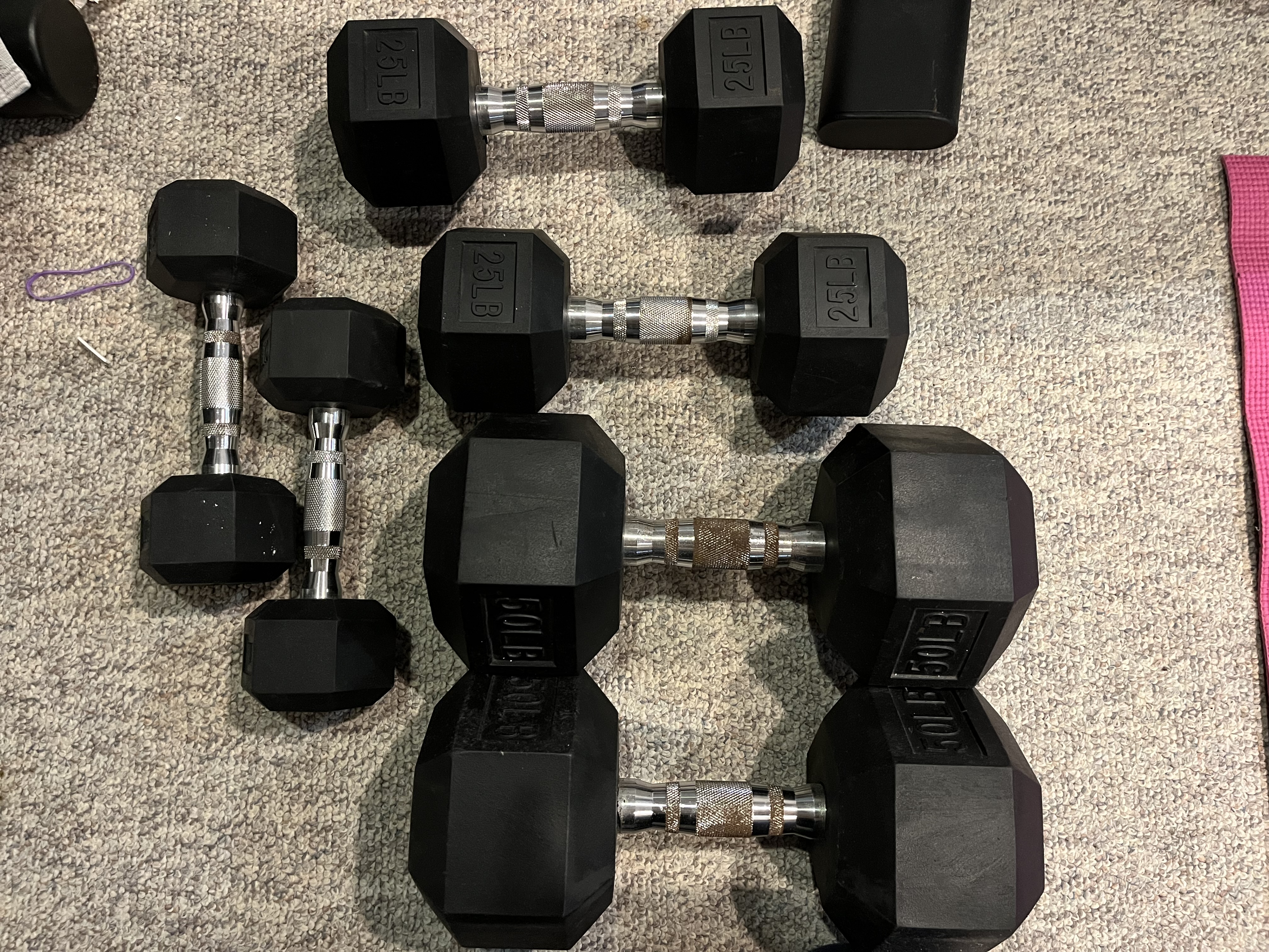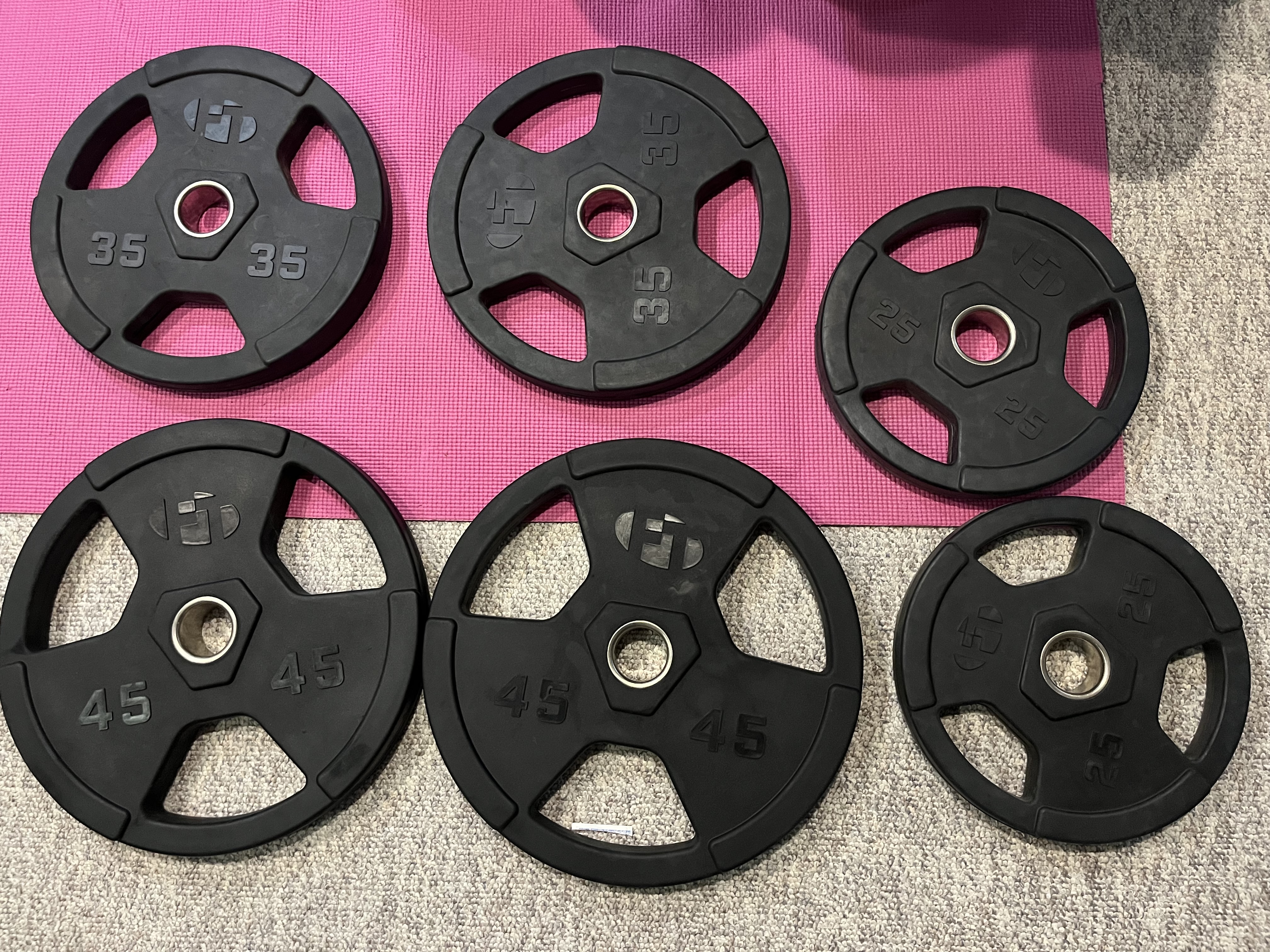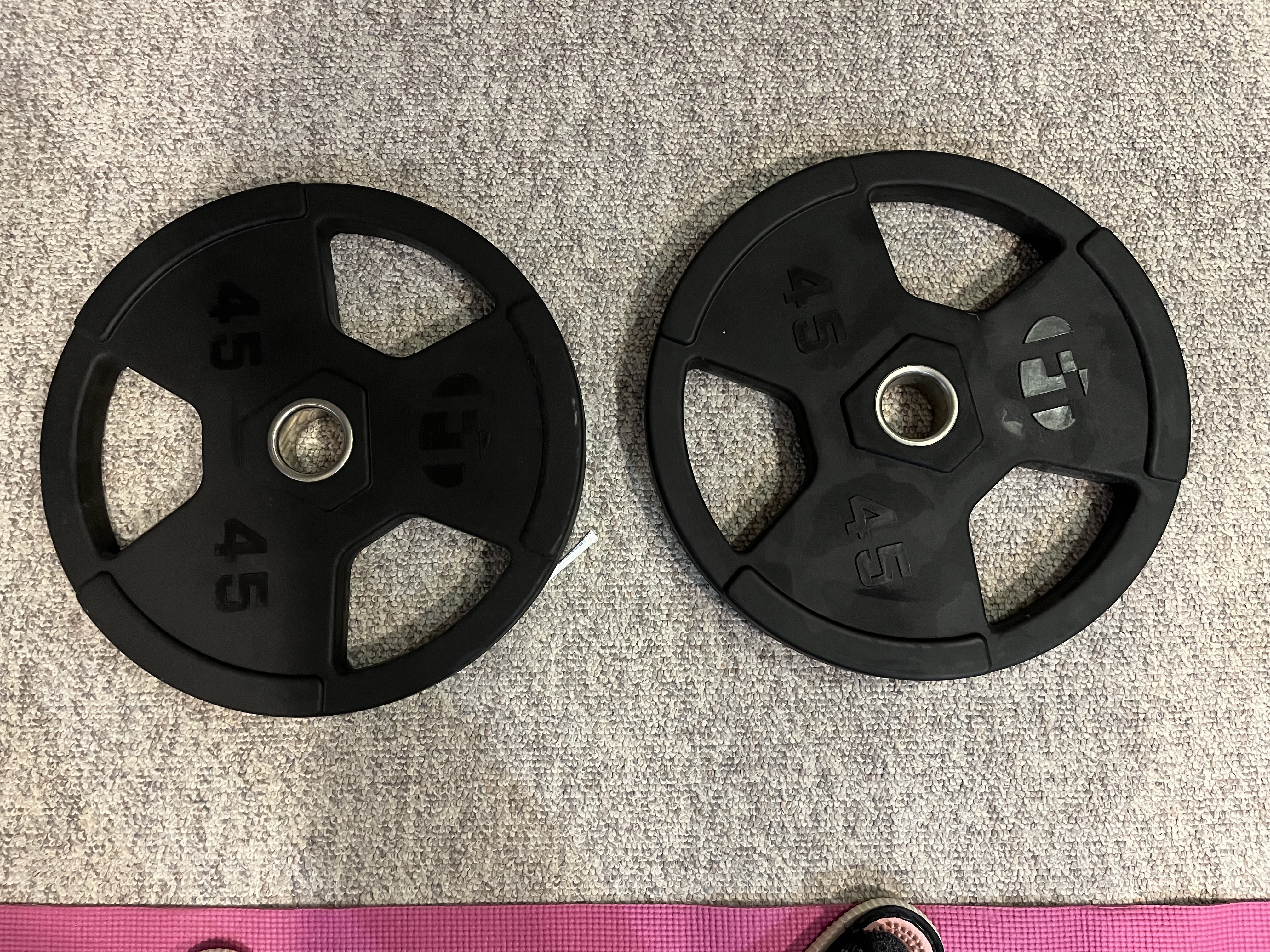 “홈트 완성! 러버 헥스 덤벨 세트(45, 25, 10파운드)와 올림픽 플레이트 세트(45, 35, 25파운드) 모두 포함! 모든 장비 상태 훌륭하고, 홈짐 꾸미기 딱이죠. 세트 전체 가격은 450달러입니다. 로컬 픽업 우선이며, 협의 가능합니다. 사진 참고하셔서, 궁금한 점 있으면 언제든 연락 주세요!”