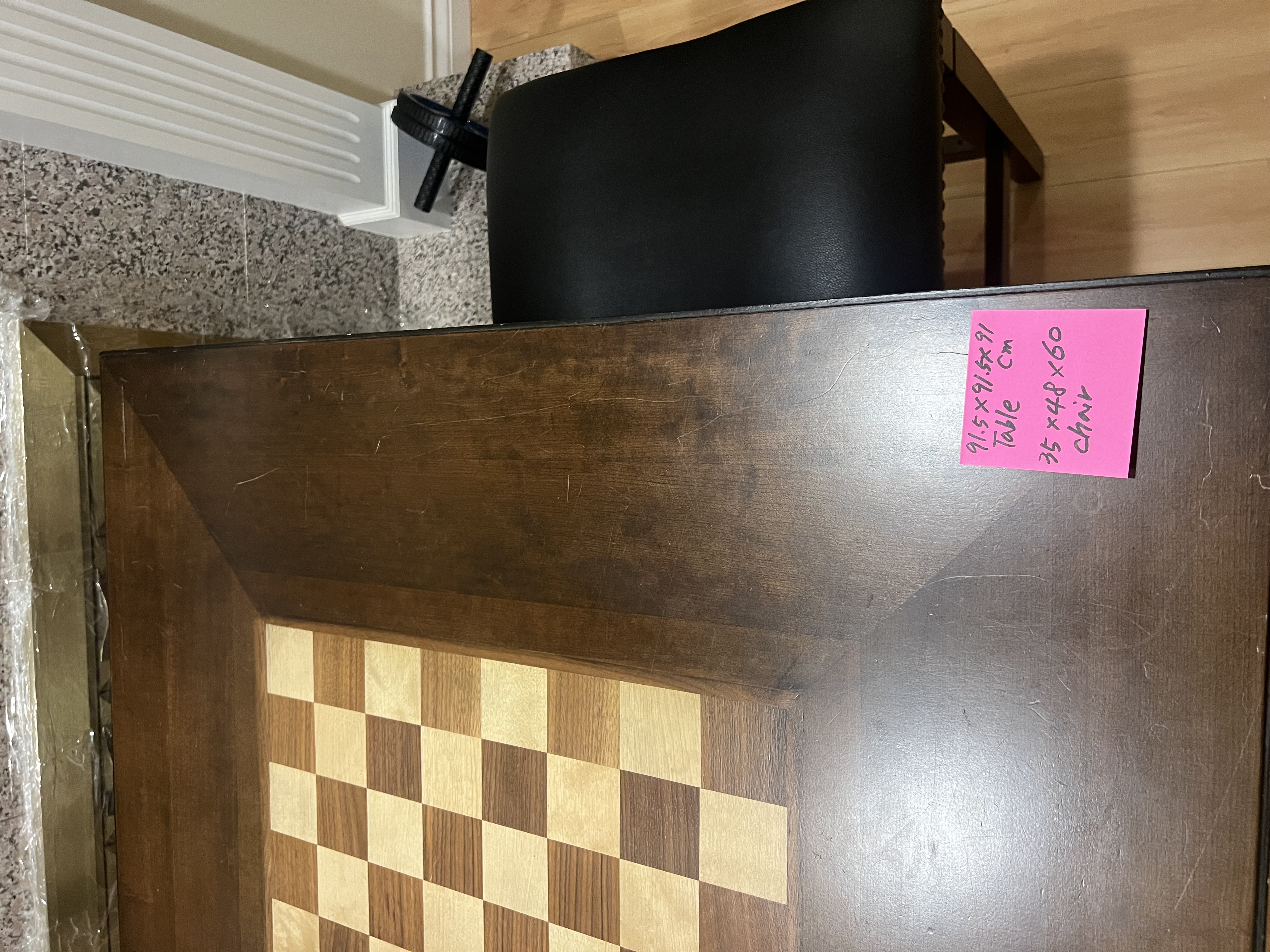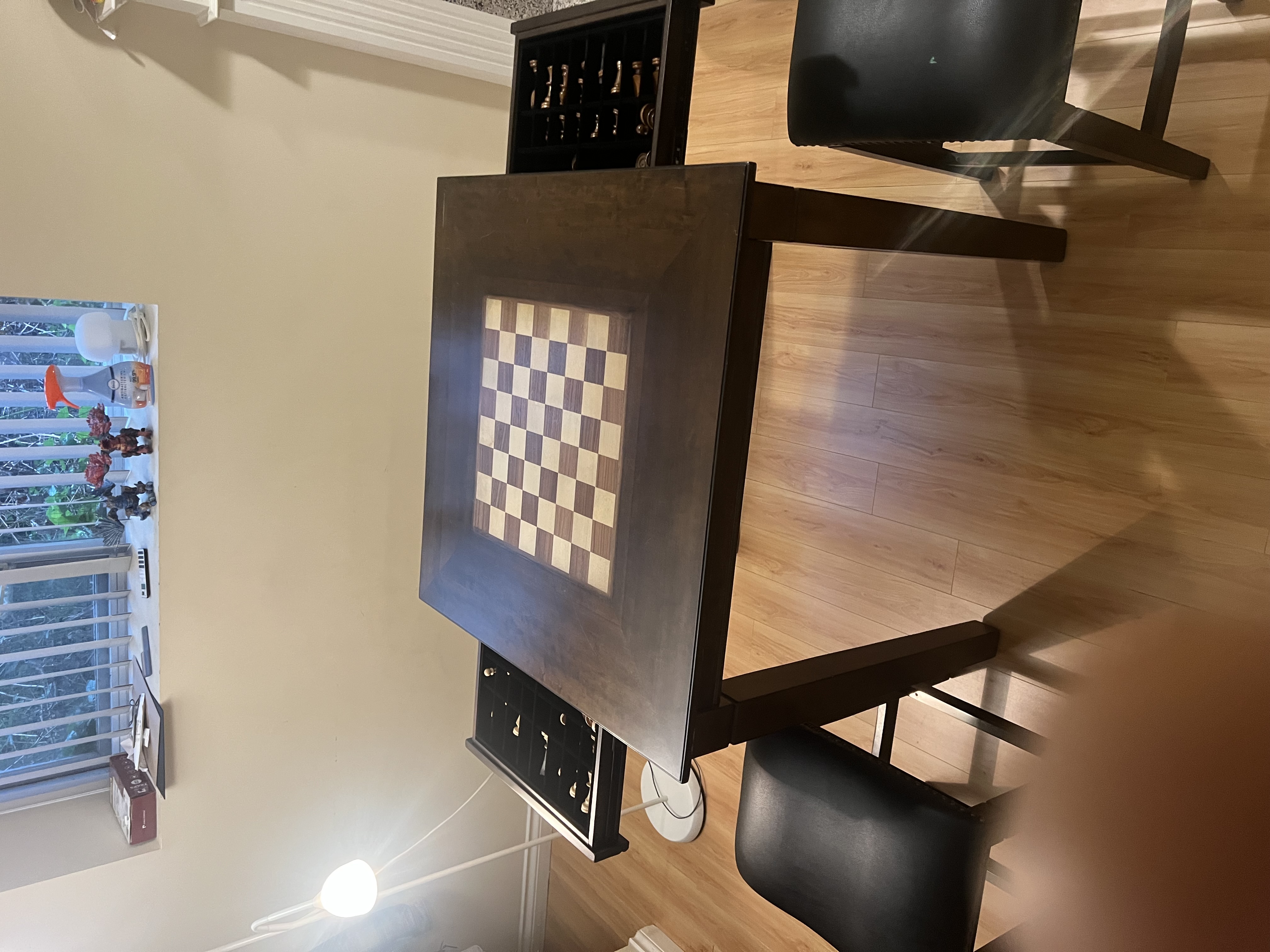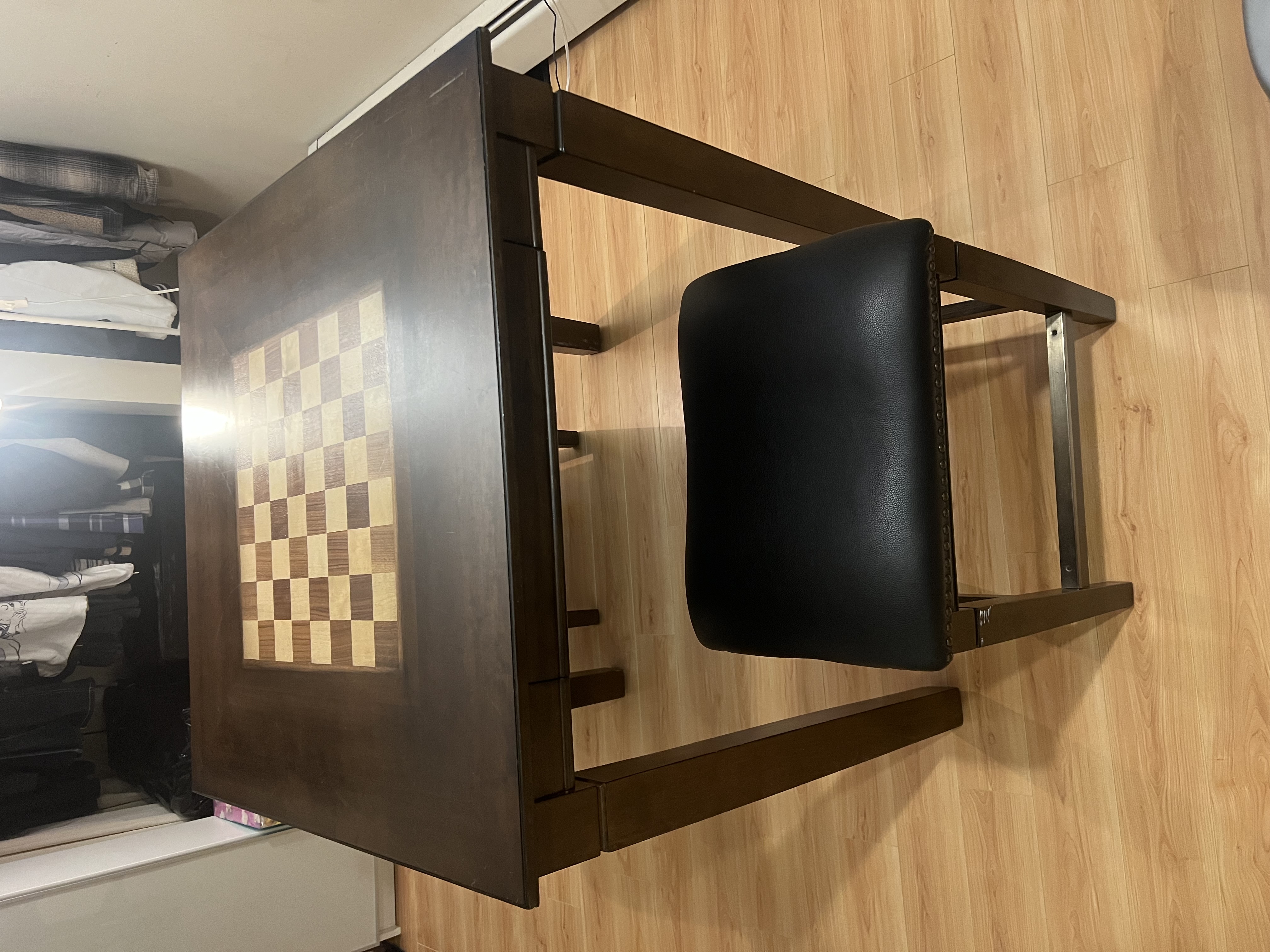체스게임 용 테이블 및 가죽 하이체어 2개 판배합니다.