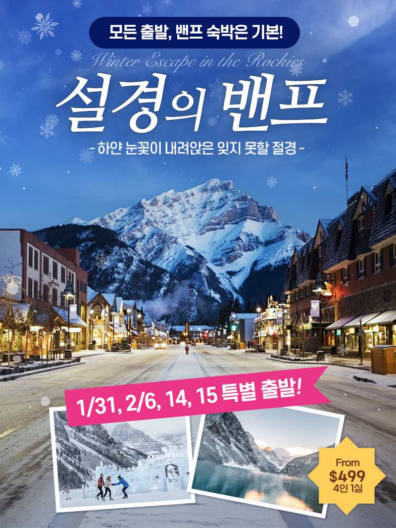 프리미엄 설경의 록키 3박 4일 (밴프 2박 숙박)출발일 : 2월 22일 특별 출발요금 : $930~ (항공 별도)캘거리 IN-OUT
