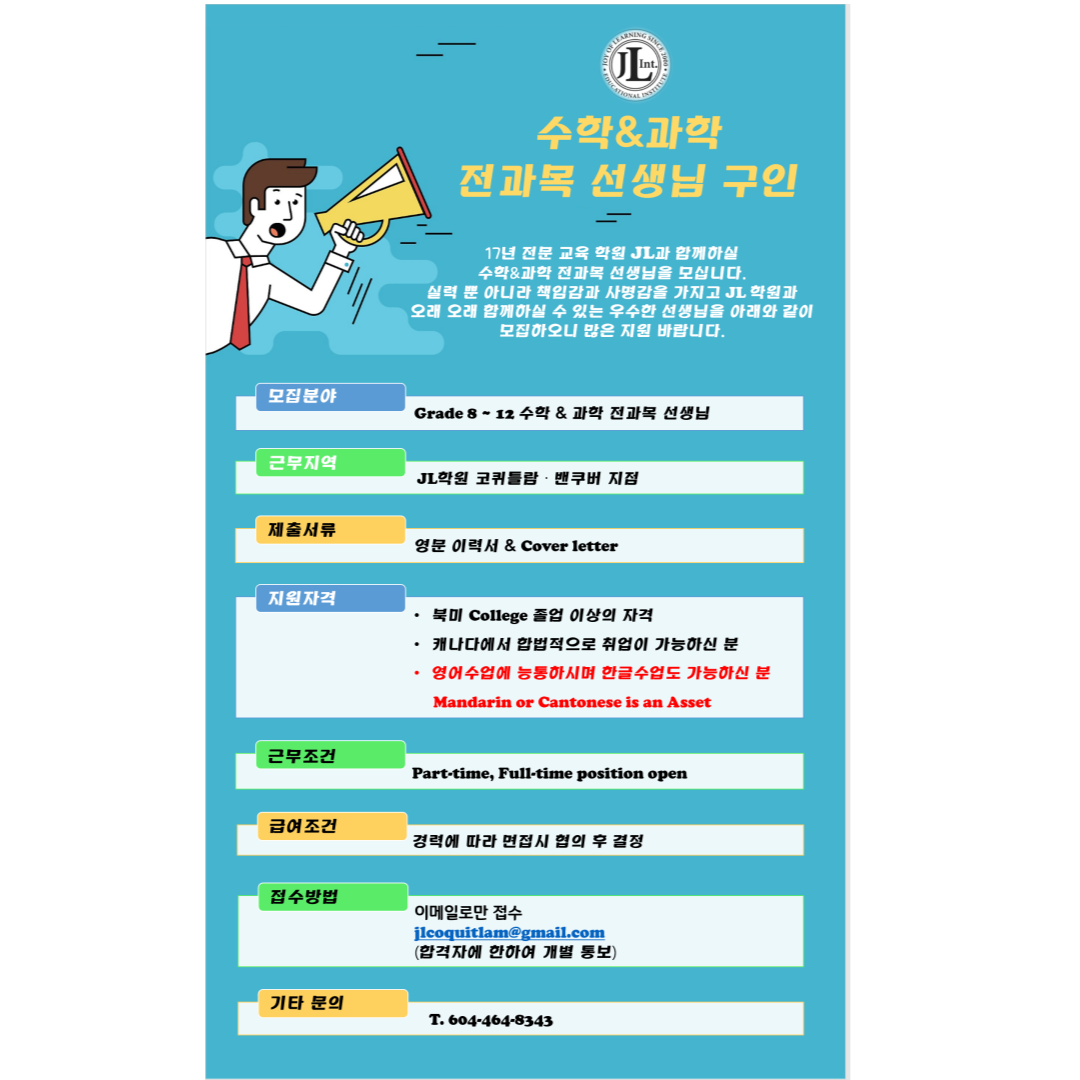 jlcoquitlam@gmail.com 으로 Resume & Coverletter 보내주시면 검토 후 개별 연락드리겠습니다.