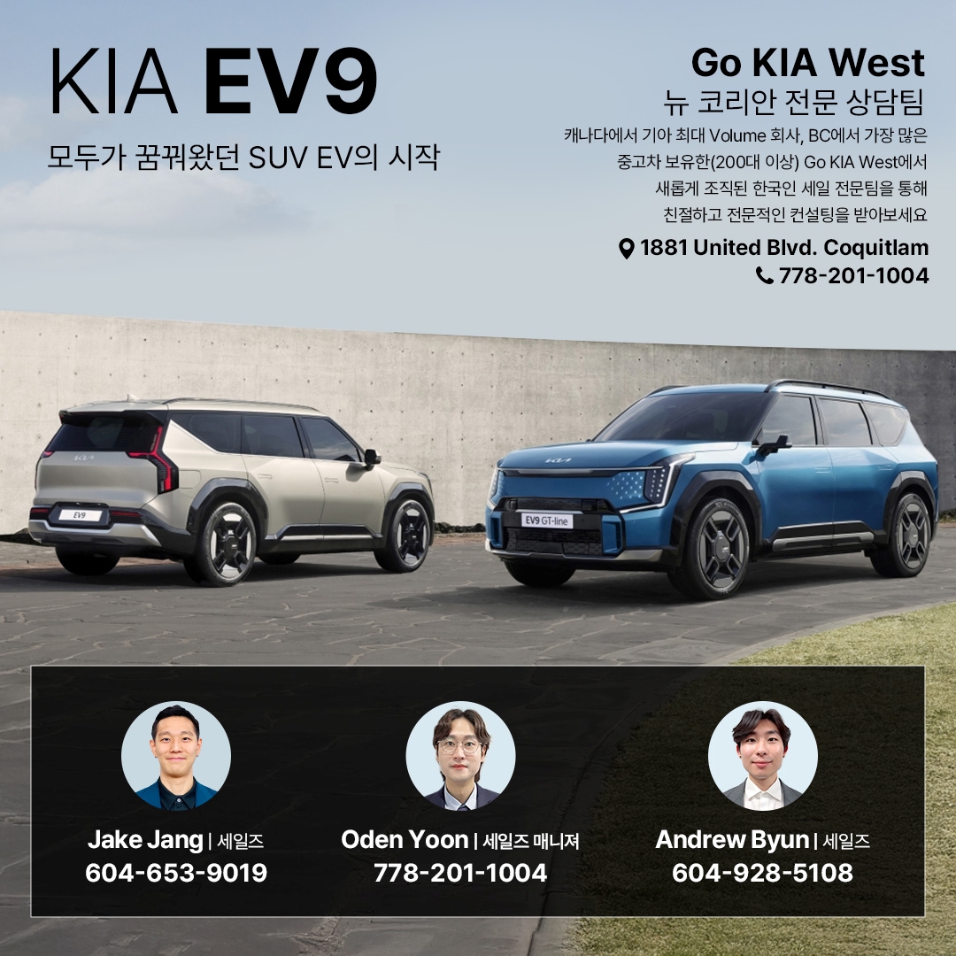 [Go Auto Group KIA West] 자동차 세일즈 인원 모집 공고모집 분야: 자동차 세일즈 / 판매 컨설턴트모집 인원: 1명근무지: [Coquitlam / Go Auto KIA West]1. 모집 대상학력: 고등학교 졸업 이상경력: 경력자 우대, 신입도 지원 가능자격 요건:자동차에 대한 열정과 관심이 있는 분고객과의 원활한 의사소통 능력을 갖춘 분성실하고 책임감 있는 자세로 업무에 임할 수 있는 분2. 담당 업무고객에게 적합한 자동차 모델을 추천 및 판매고객 상담 및 상담 기록 관리차 판매 관련 업무 (계약 체결, 차량 인도, A/S 관리 등)판매 목표 달성을 위한 전략적 접근3. 근무 조건급여: 커미션 ( $3,000 ~ $11,000 per month )4. 전형 절차서류 전형면접 (개별 인터뷰)5. 지원 방법이력서를 oyoon@kiawest.com 로 제출종종 스팸으로 넘어 가기 때문에 문자 부탁드립니다.KIA West SalesmanagerOden Yoon778-201-1004