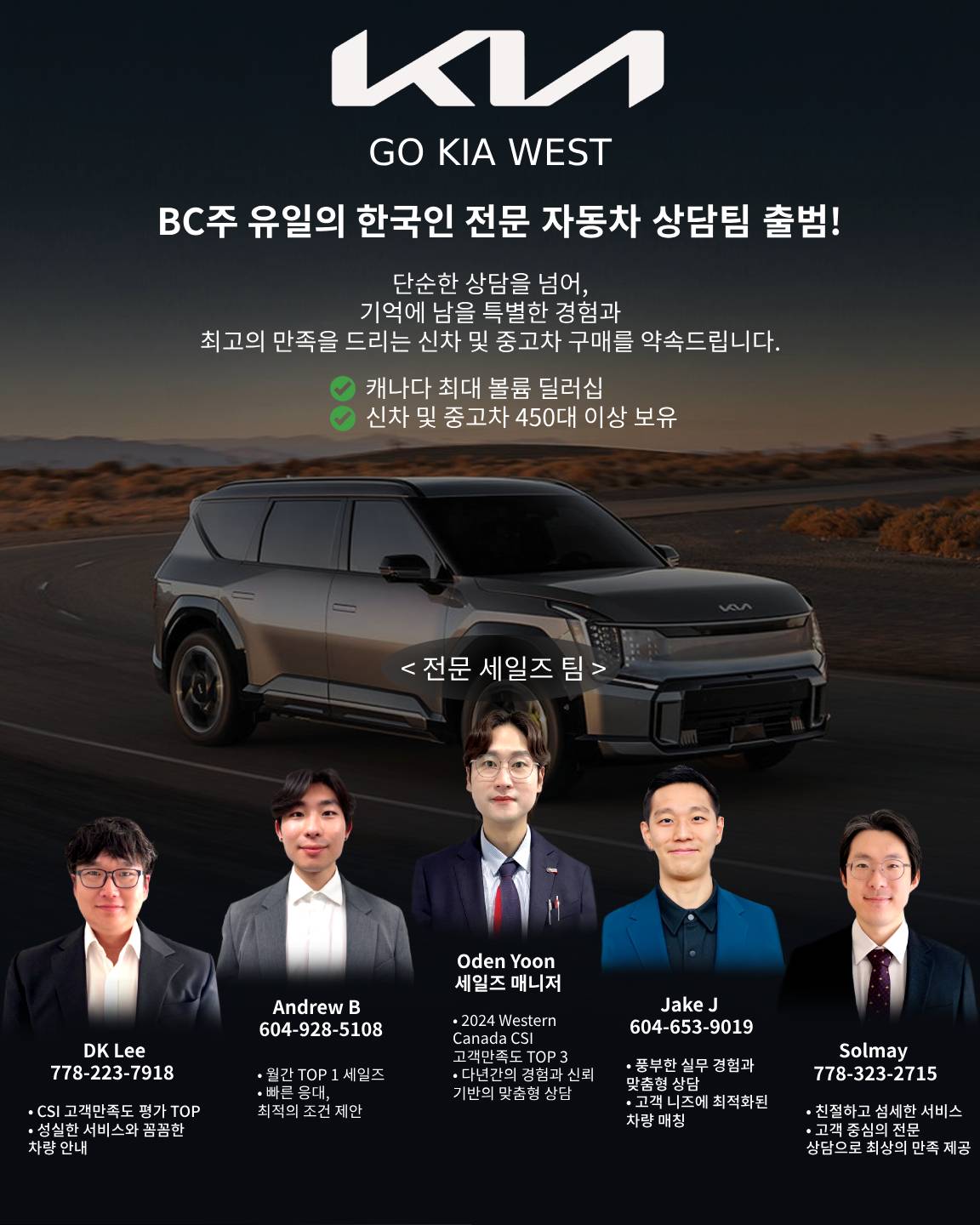 [Go Auto Group KIA West] 자동차 세일즈 인원 모집 공고모집 분야: 자동차 세일즈 / 판매 컨설턴트모집 인원: 1명근무지: [Coquitlam / Go Auto KIA West]1. 모집 대상학력: 고등학교 졸업 이상경력: 경력자 우대, 신입도 지원 가능자격 요건:자동차에 대한 열정과 관심이 있는 분고객과의 원활한 의사소통 능력을 갖춘 분성실하고 책임감 있는 자세로 업무에 임할 수 있는 분2. 담당 업무고객에게 적합한 자동차 모델을 추천 및 판매고객 상담 및 상담 기록 관리차 판매 관련 업무 (계약 체결, 차량 인도, A/S 관리 등)판매 목표 달성을 위한 전략적 접근3. 근무 조건급여: 커미션 ( $3,000 ~ $11,000 per month )4. 전형 절차서류 전형면접 (개별 인터뷰)5. 지원 방법이력서를 oyoon@kiawest.com 로 제출종종 스팸으로 넘어 가기 때문에 문자 부탁드립니다.KIA West SalesmanagerOden Yoon778-201-1004