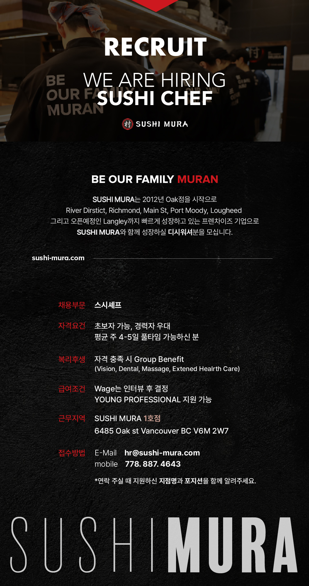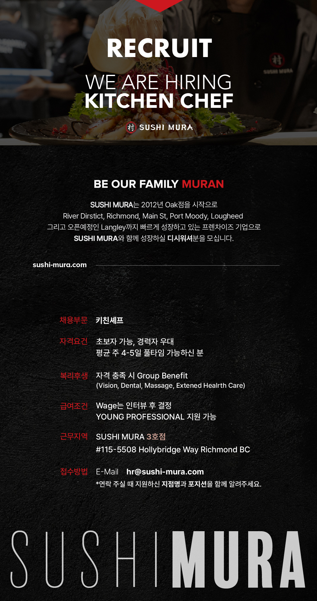 스시무라 Richmond 지점에서 풀타임 주방 쿡 구합니다!