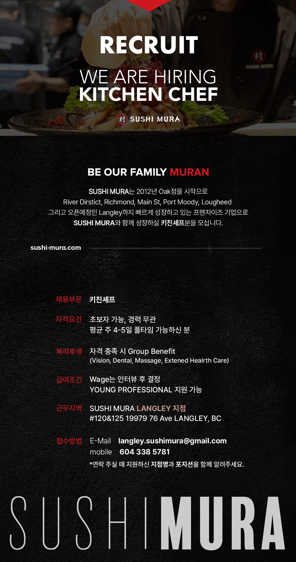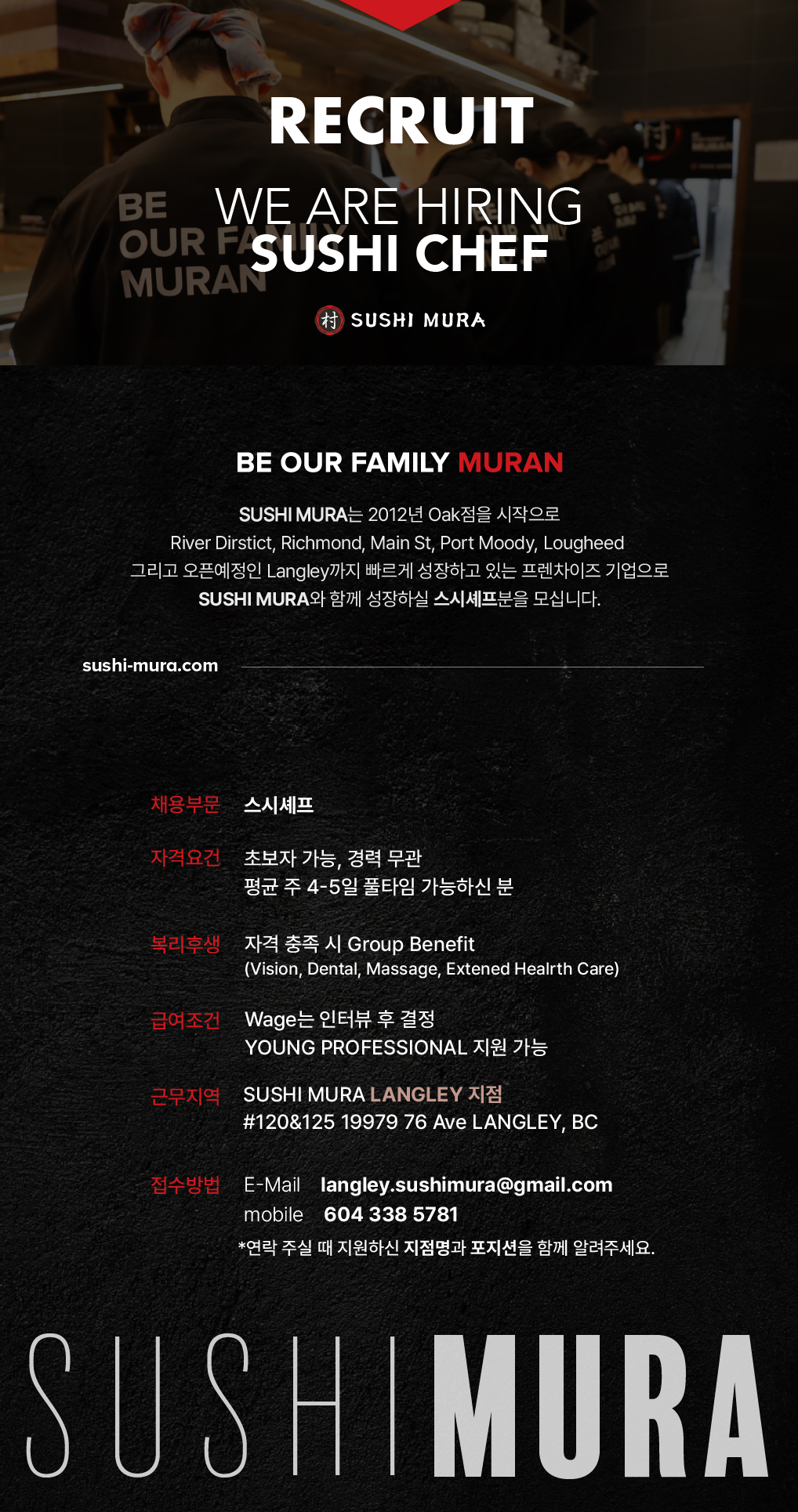 스시무라 랭리지점에서 다음과 같은 포지션 구인중입니다!