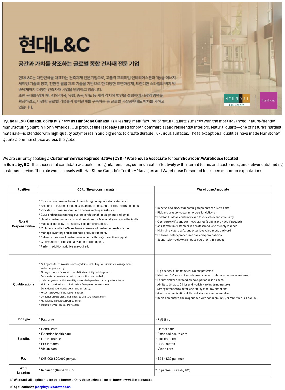 [Hyundai L&C Canada / Burnaby 지점 직원채용]