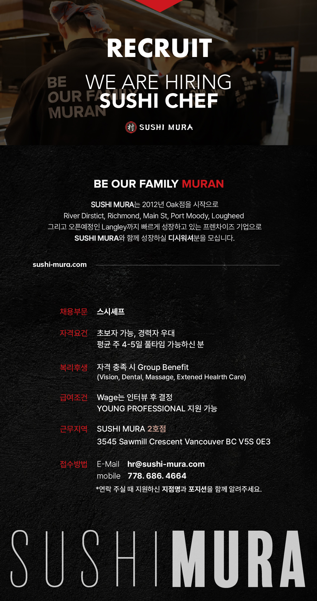 스시무라 리버 디스트릭트지점에서 풀타임 스시쉐프 구합니다