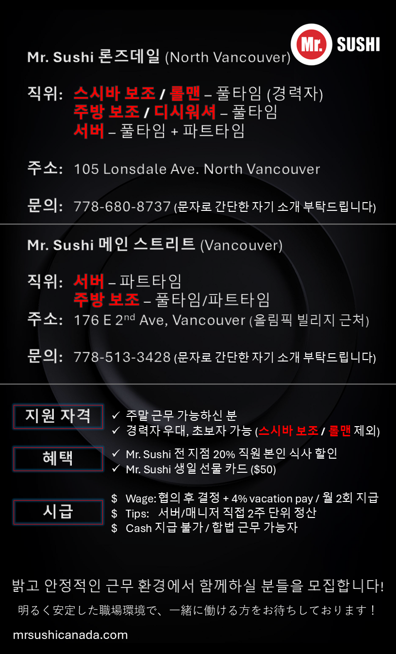 혜택: Mr. Sushi 전 지점 20% 직원 본인 식사 할인Mr. Sushi 생일 선물 카드 ($50)