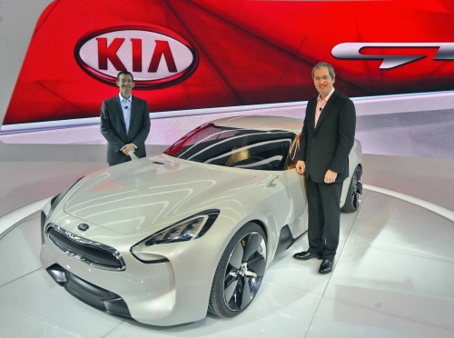 - ▲ LA오토쇼에서 기아차 임원이 콘셉트카 'Kia GT'앞에 포즈를 취하고 있다.