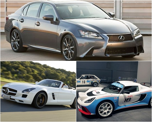- ▲ (위부터 시계방향)토요타 렉서스 GS350 F스포츠, 로터스 Exige R-GT, 메르세데스벤츠 SLS AMG 로드스터
