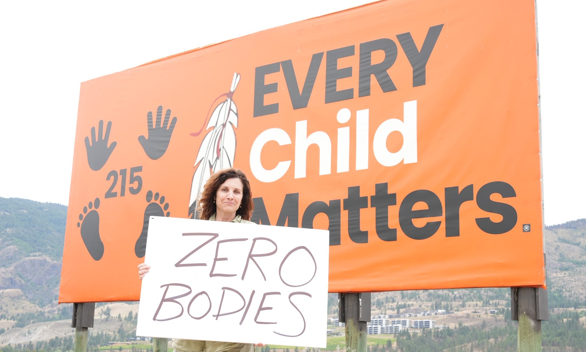 ▲달라스 브로디 BC주 의원이 캠룹스 기숙학교 희생 어린이를 기리는 ‘모든 어린이는 소중하다’라는 문구 앞에서 ‘유해는 0개’라고 적힌 사인을 들고 서 있다. / Dallas Brodie X 원주민...