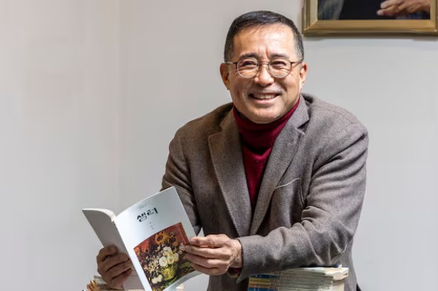 김성구 월간 ‘샘터’ 발행인이 자신의 사무실에서 한동안 최신호로 남을 샘터 2026년 1월호를 들어 보이고 있다. ‘첫마음’을 주제로 한 이번 호에 고명재 시인이 기고한 글엔 이런...