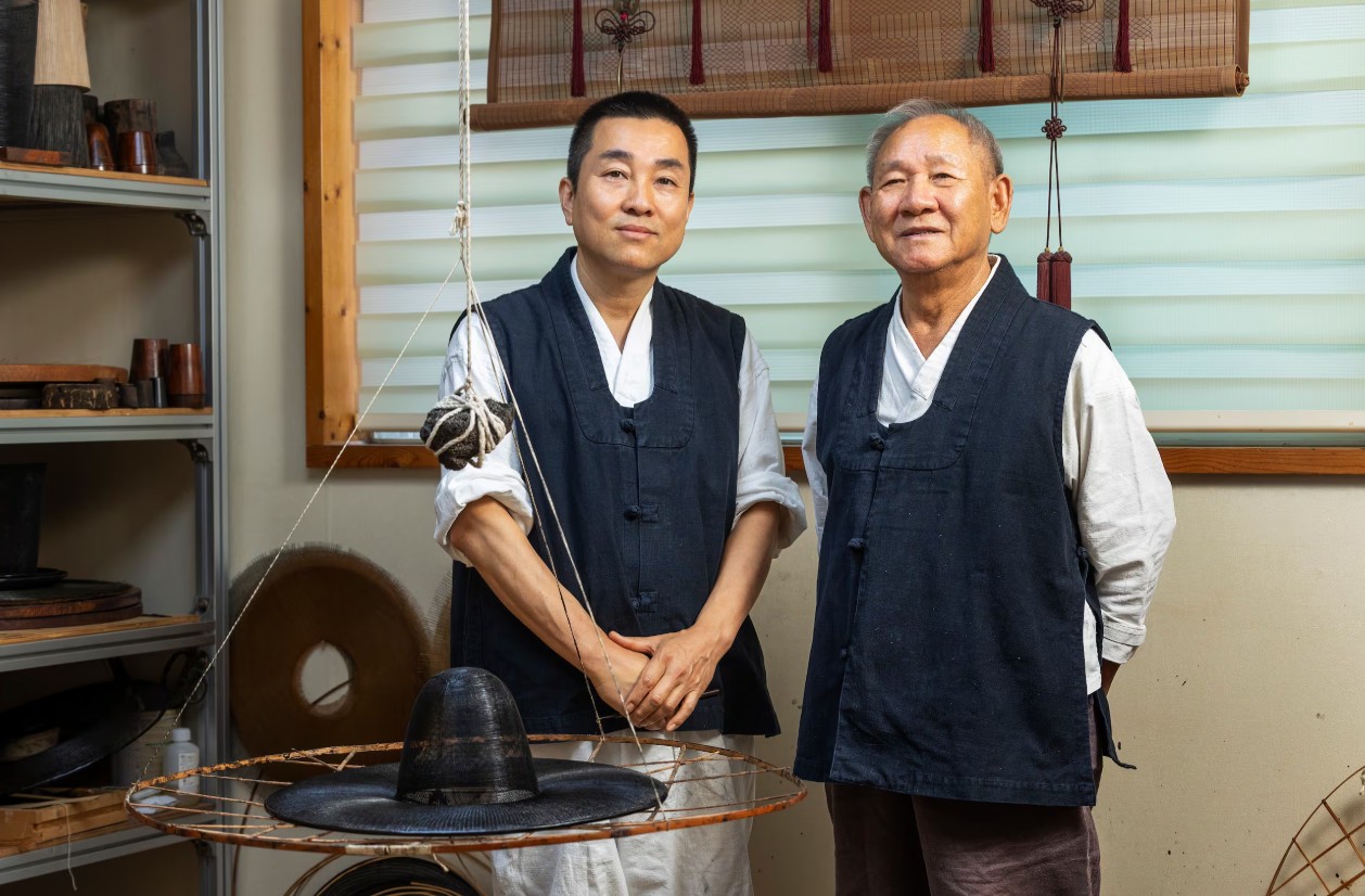 갓일 명가는 4대째 박창영 선생에게서 5대째 박형박 이수자에게로 이어지고 있다. 부자 앞에 놓인 완성 단계인 갓 가격이 2000만원 정도다. /양수열 영상미디어 기자“저 검은 모자에 완전...