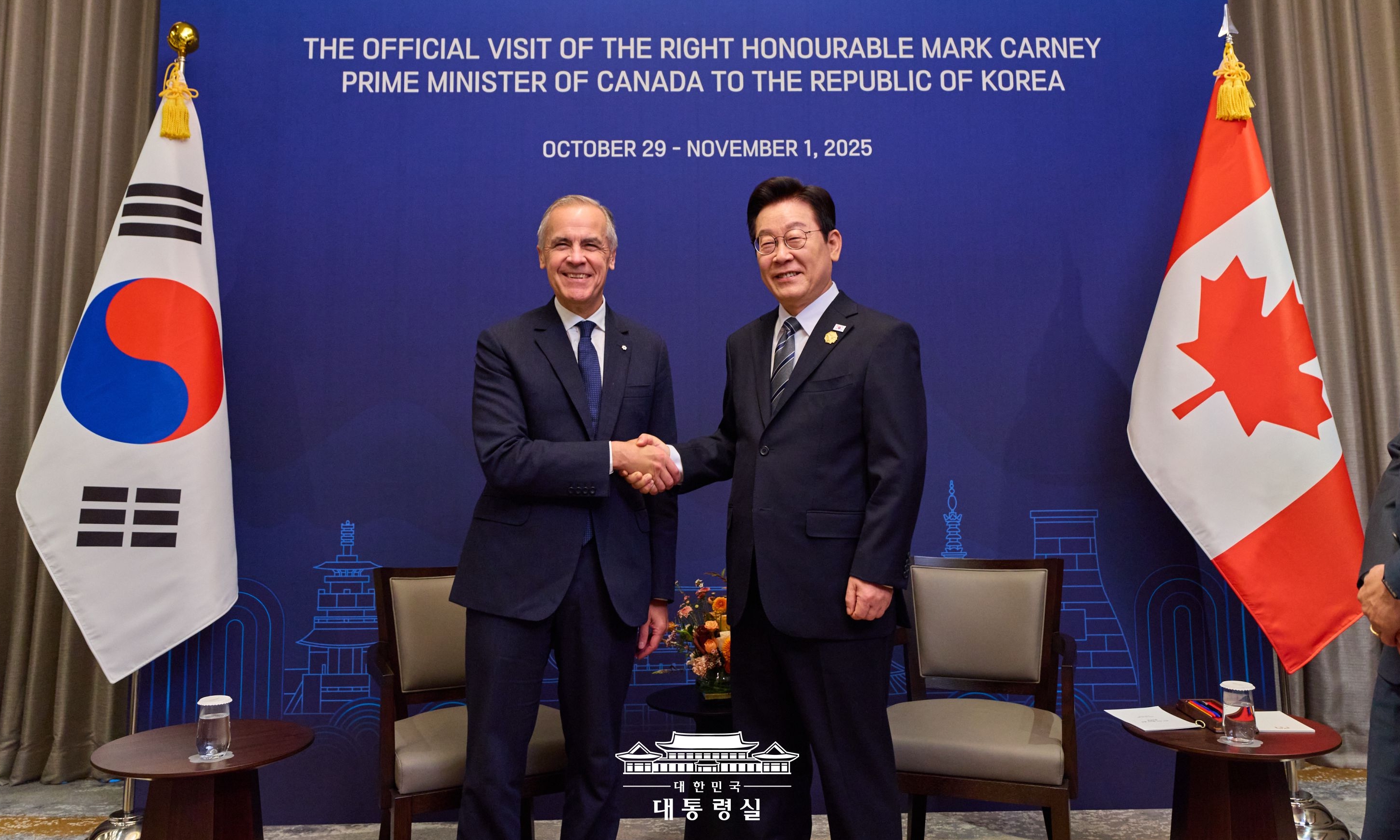 ▲19월 경주화백컨벤션센터(HICO)에서 열린 2025 아시아태평양경제협력체(APEC) 정상회의에서 이재명 대통령과 마크 카니 총리가 악수하고 있다. /대통령실캐나다 잠수함 사업(CPSP·Canadian Patrol...