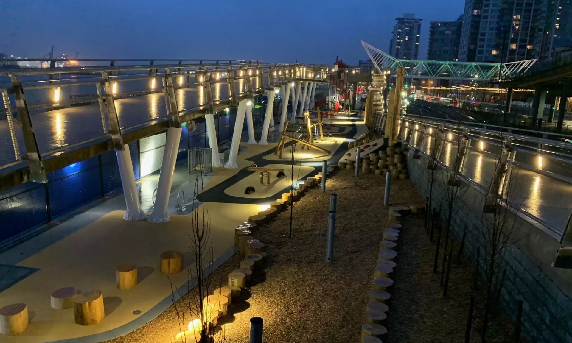지어진 독특한 구조와 2.5km에 달하는 아름다운 워터프런트 산책로를 자랑한다. 특히 저녁에는 조명이 켜진 강변의 야경이 아름다워 산책과 사진 촬영 장소로 인기가 높다. 현대식 놀이터, 농구 코트, 피크닉