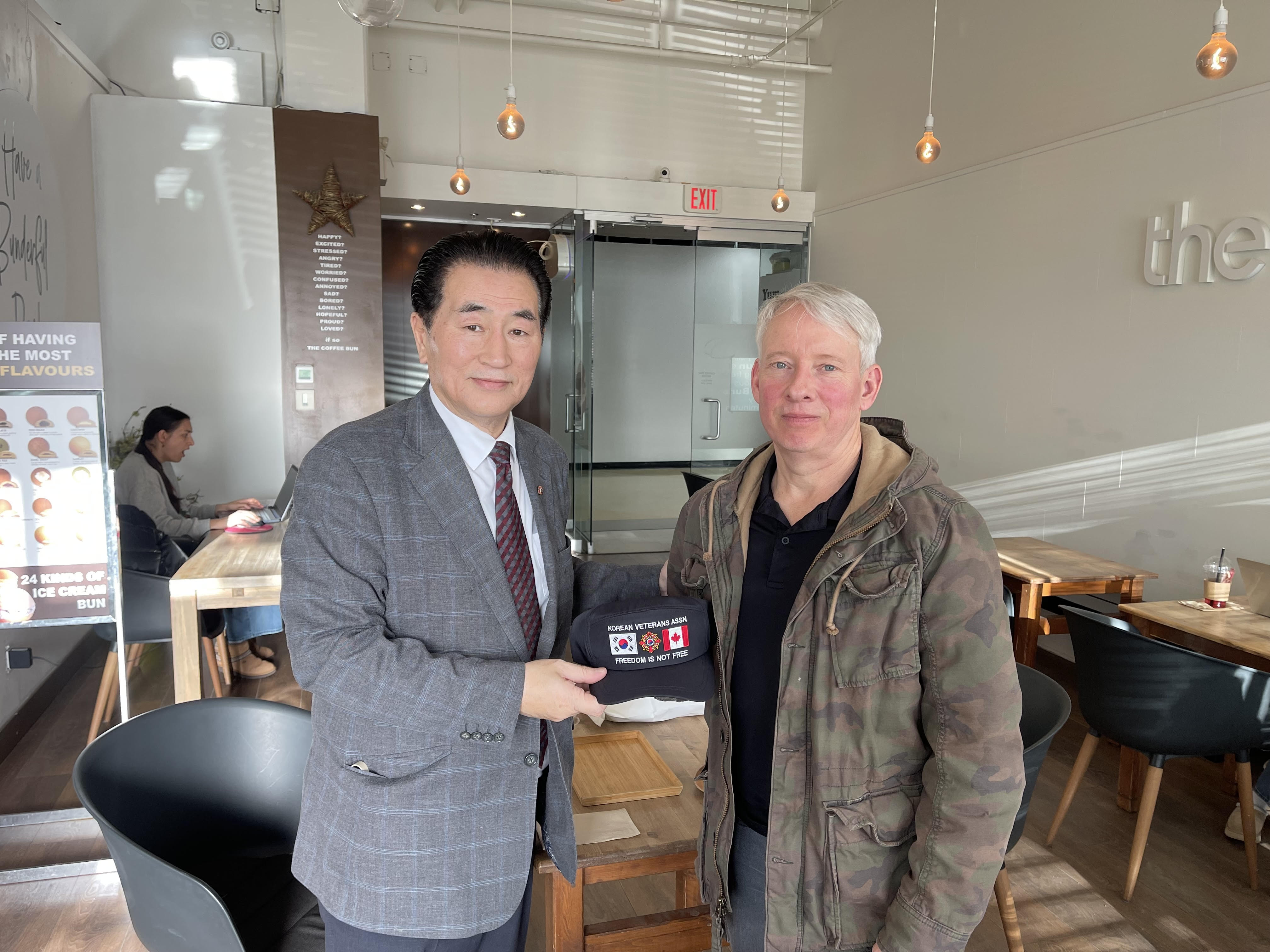 재향군인회 캐나다 서부지회 장민우 회장은 지난 20일, 한국전 참전용사회(KVA) 명예회원인 가이 블랙(Guy Black) 씨를 만나 향군 모자와 향군 넥타이를 전달하며 환담을 나눴다.
