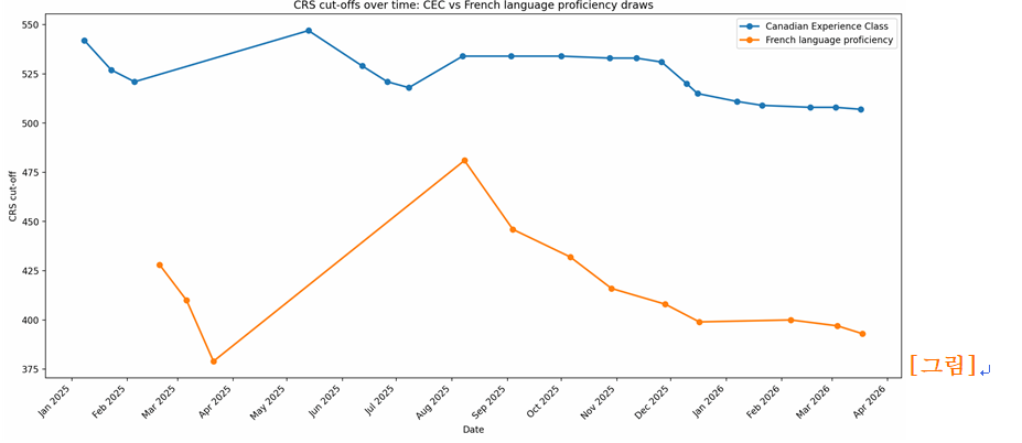 이 지점에서 중요한 해석이 필요합니다. 지금의 Express Entry는 단순히 점수를 올리는 게임이 아니라, 어떤 카테고리 안에 들어가느냐가 더 중요한 구조로 변화하고 있습니다. 실제로 최근 추첨 데이터를 보면 일반 통합 점수 경쟁보다는 CEC, 프랑스어, 특정 직군 중심의 선발이 명확하게 강화되고 있습니다.