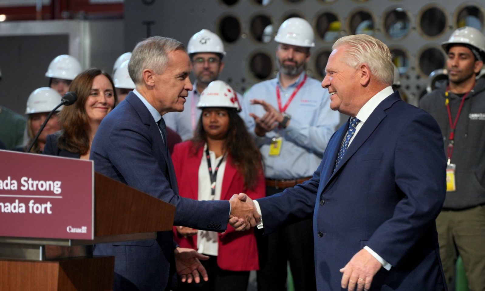 ▲23일 보우먼빌에서 열린 기자회견에서 마크 카니 총리(왼쪽)와 더그 포드 온타리오 수상이 악수를 하고 있다. / Doug Ford X 캐나다와 온타리오 정부가 30억 달러를 투자해 G7 국가 최초의...