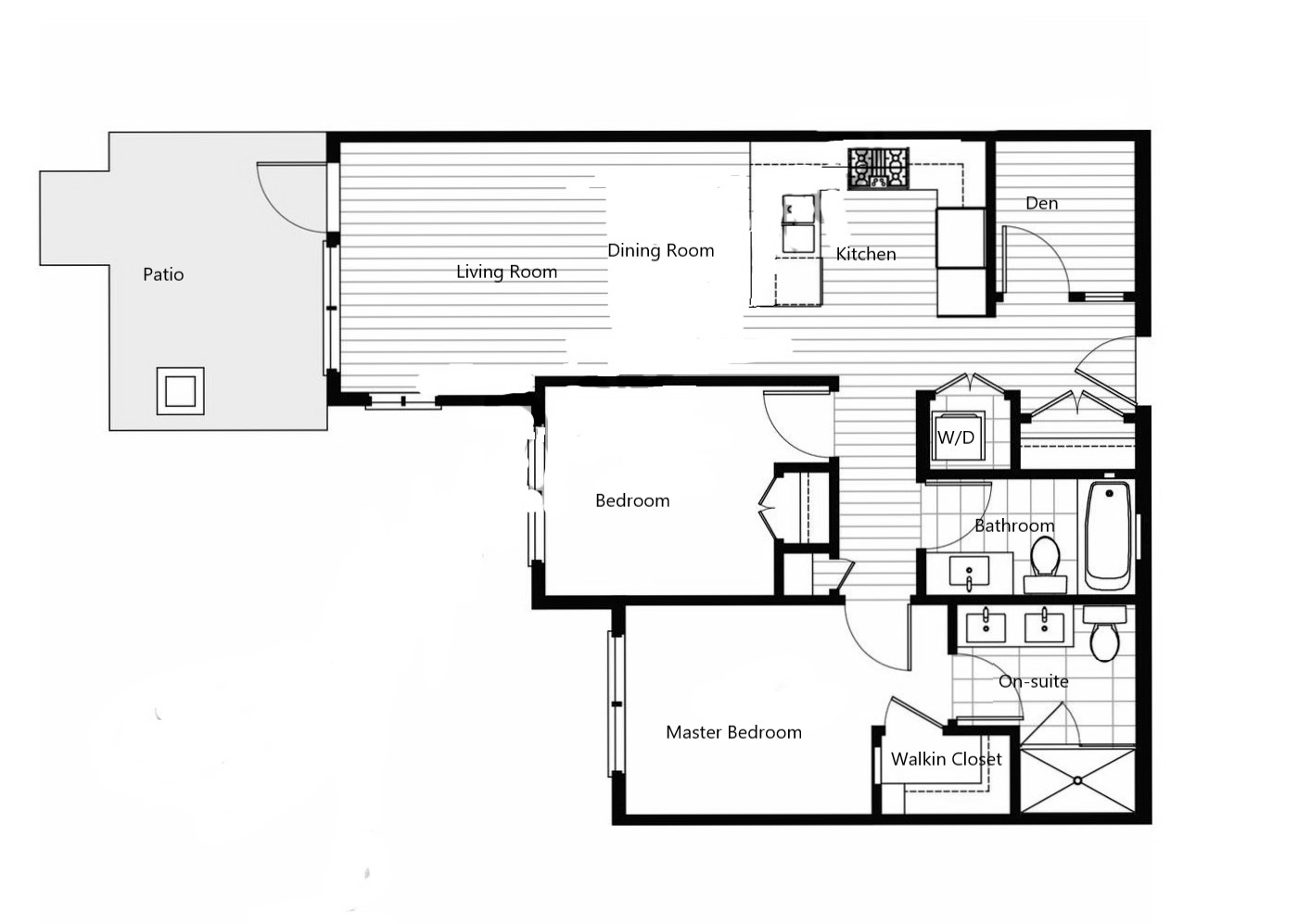 구조: 2 침실 + 1 덴 / 2 욕실 (860 sf + 전용 파티오)