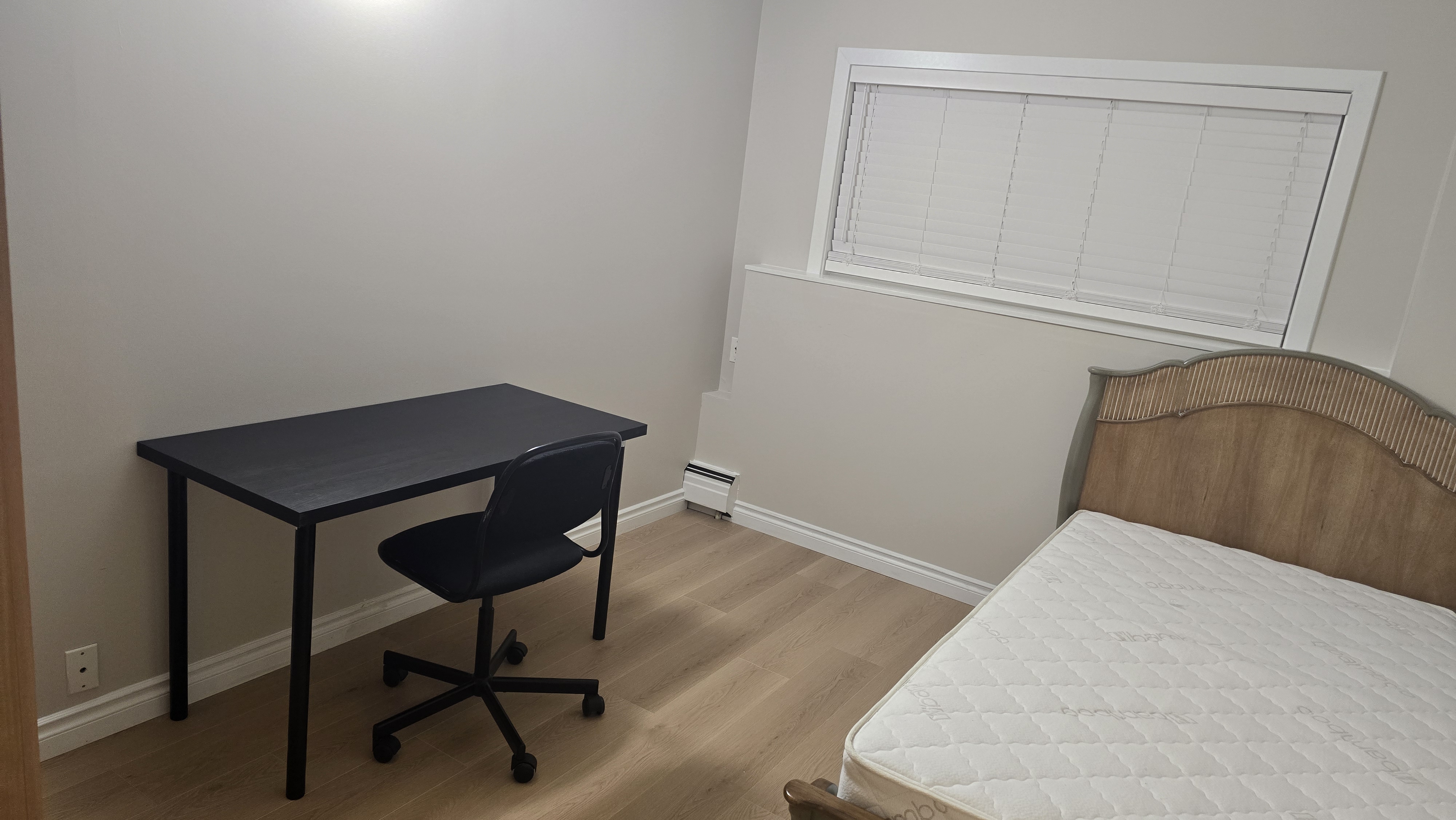 A private room is available in a 4-bedroom, 2-bathroom sub-basement unit of a house. From the back, it’s at ground level; from the front, it looks like a basement, but don’t worry, the room has large windows with lots of natural light!