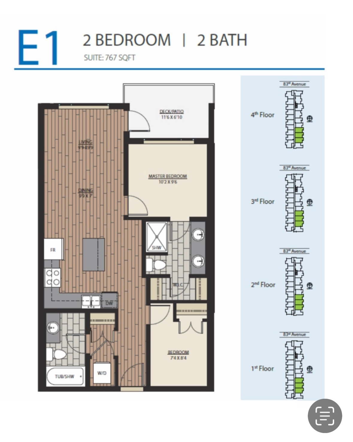 2베드 2배쓰 767sqft 2층 유닛