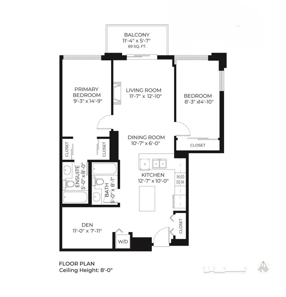 유닛은 33층에 위치하고 있으며 방 2개와 화장실 2개 그리고 홈 오피스나 게스트룸으로 활용 가능한 큰 덴 1개가 있습니다.