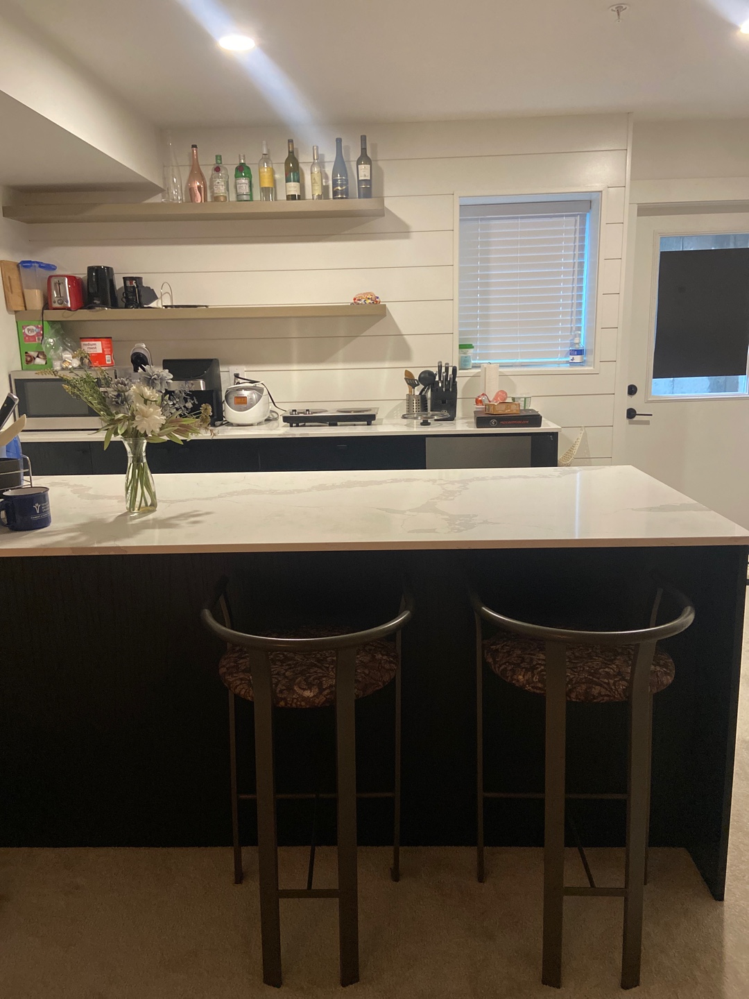 주방 의자 2개, 화장실 커튼과 러그
