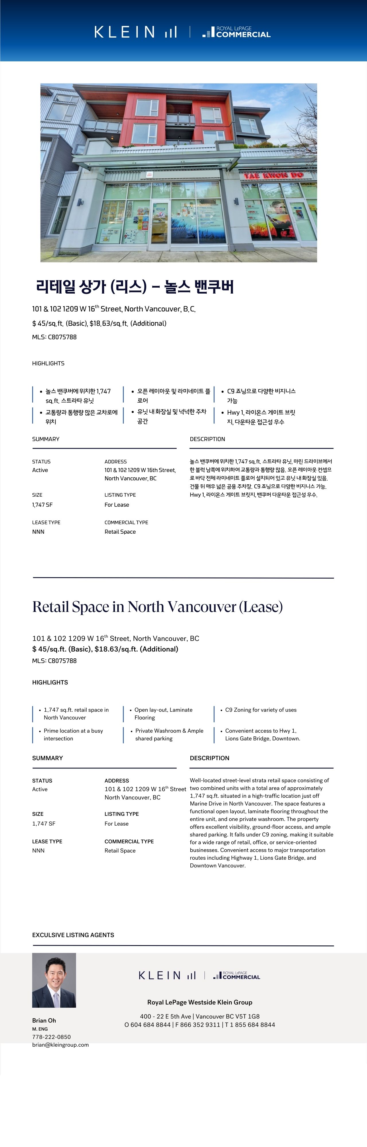 | 이메일 | brian@kleingroup.com | 입주일자 | - |
